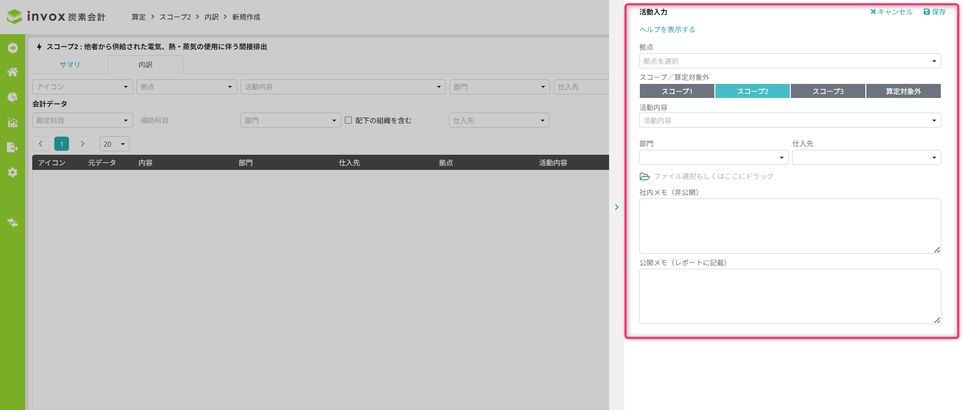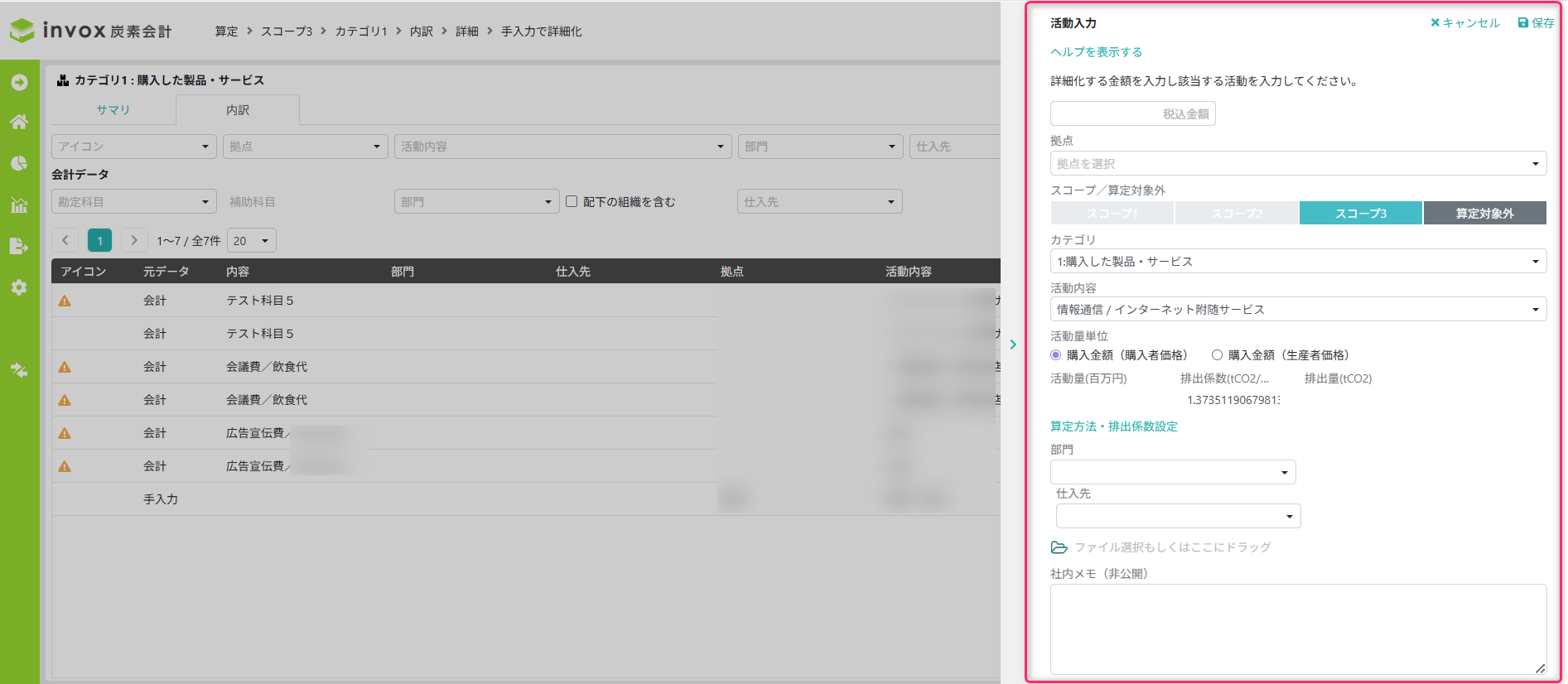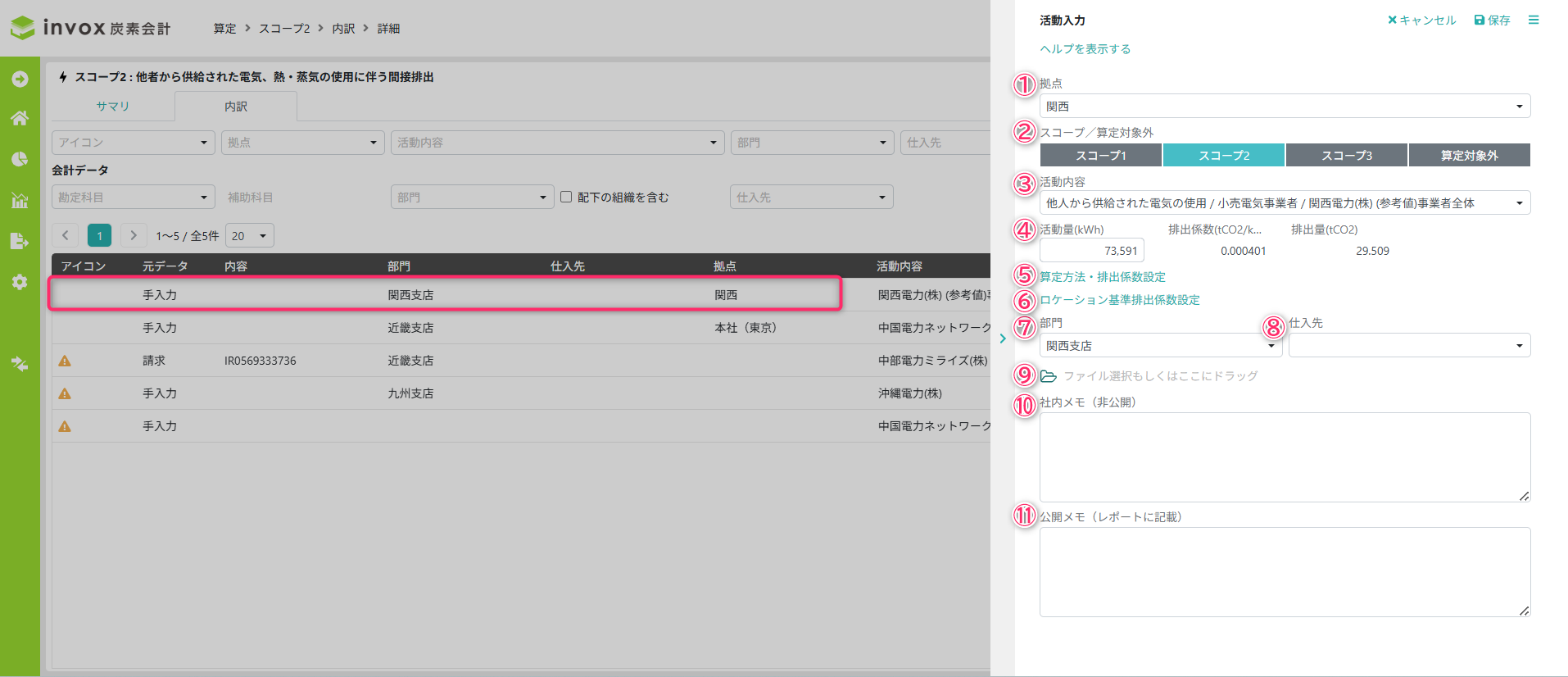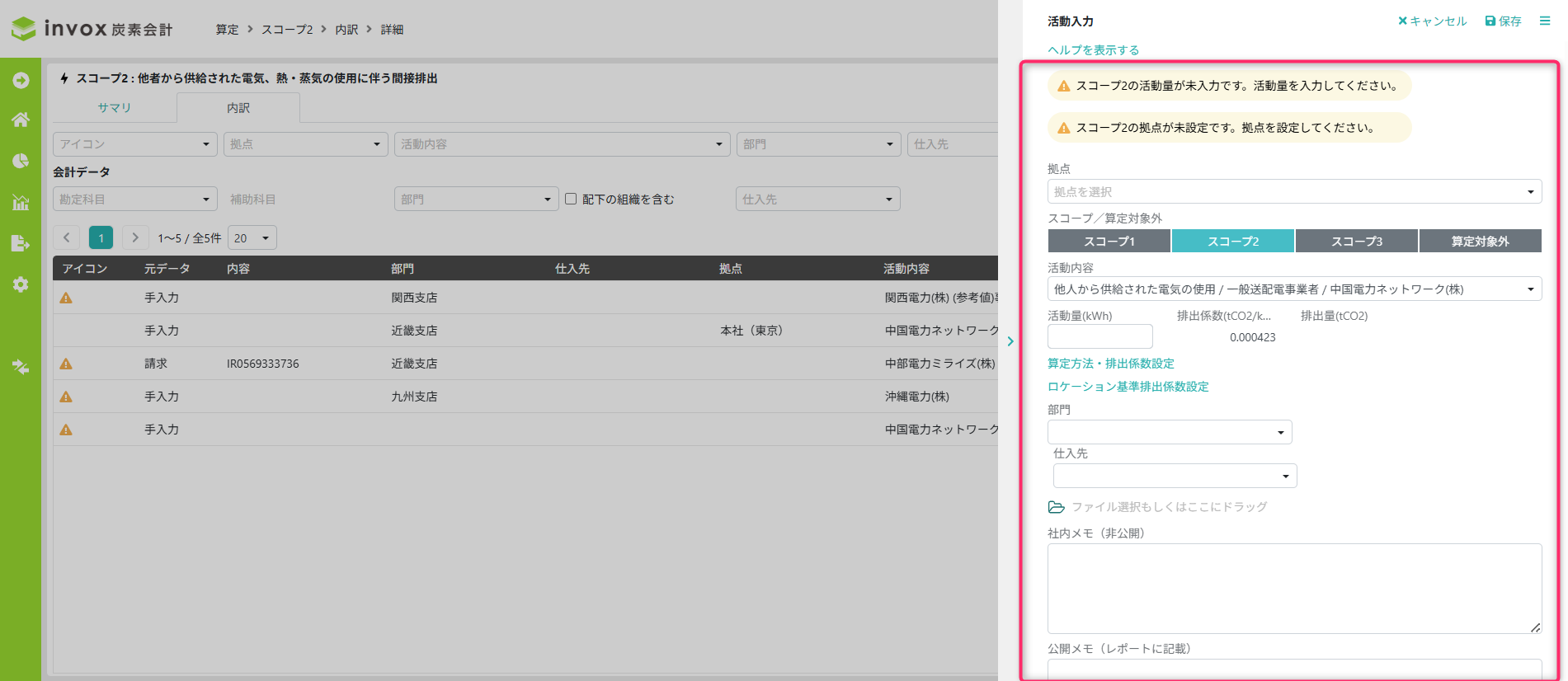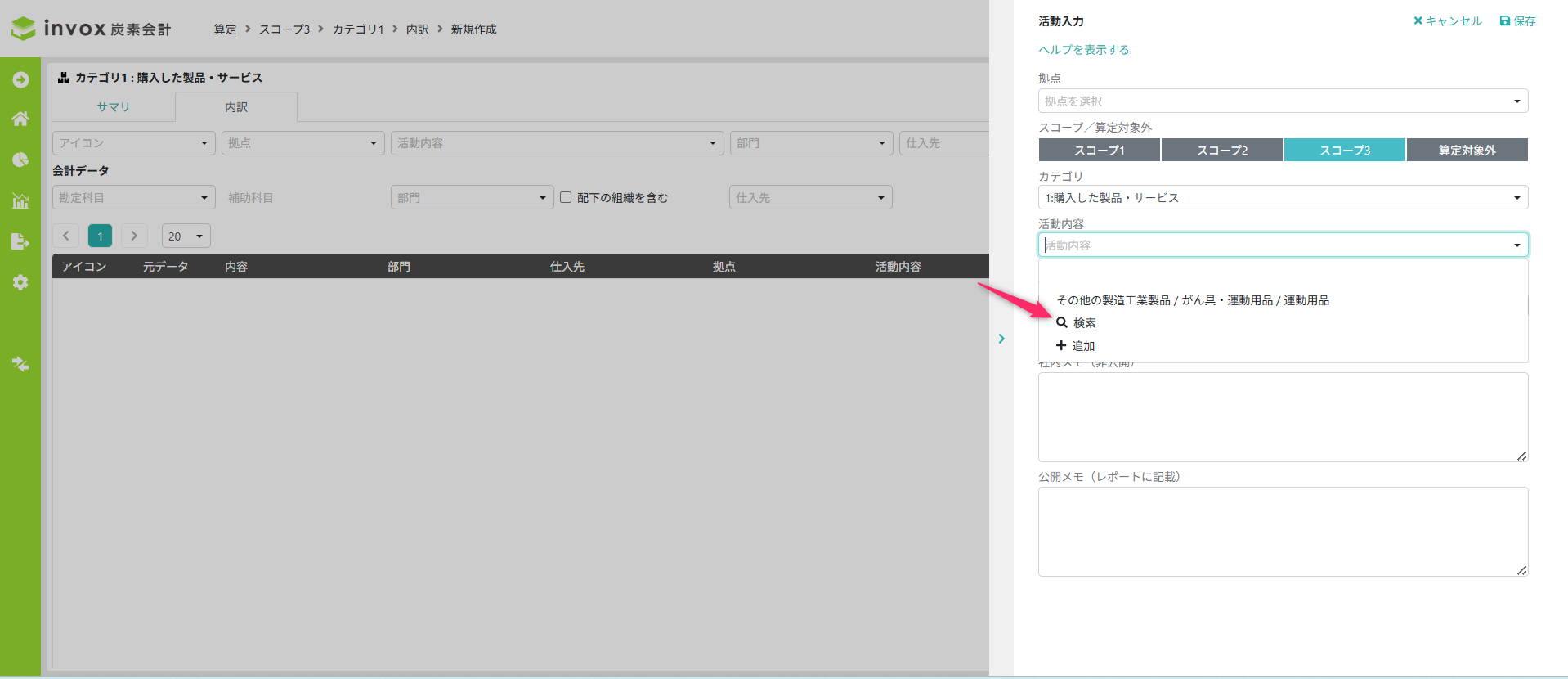 各スコープ、カテゴリ毎に振り分けられたデータに対して活動量や排出量の入力を行います。