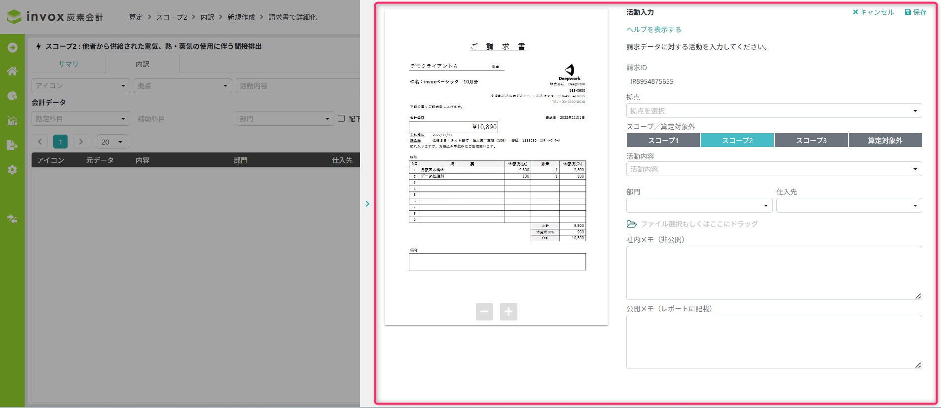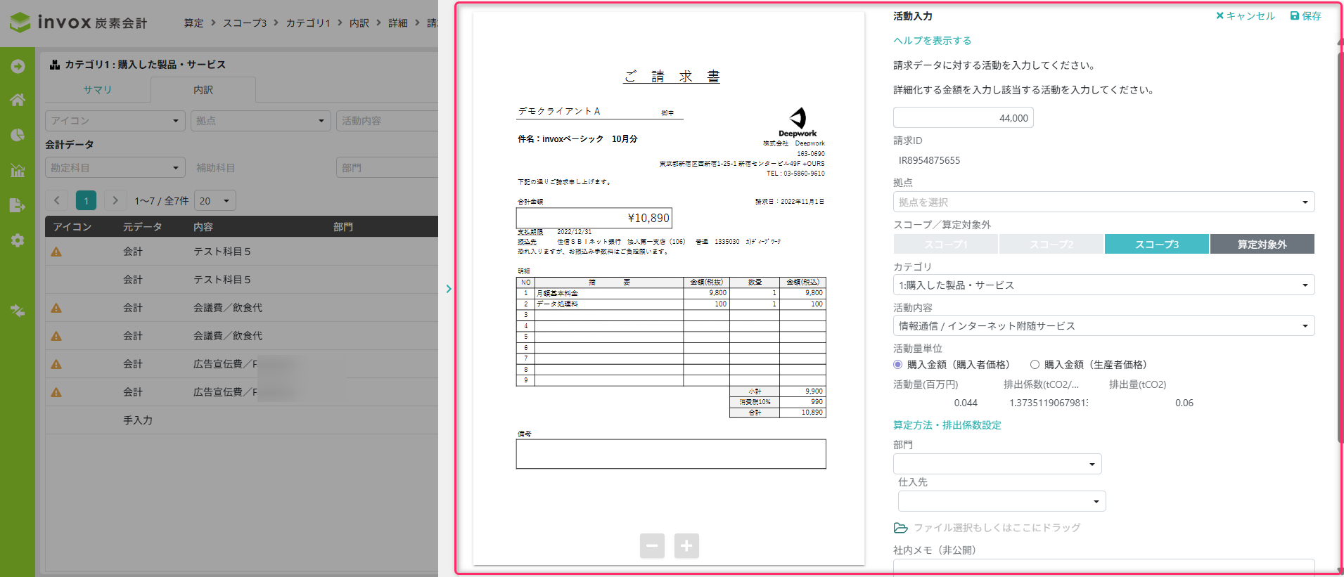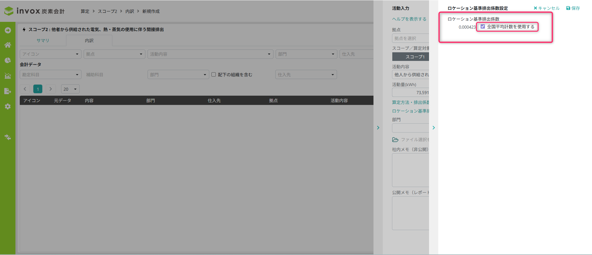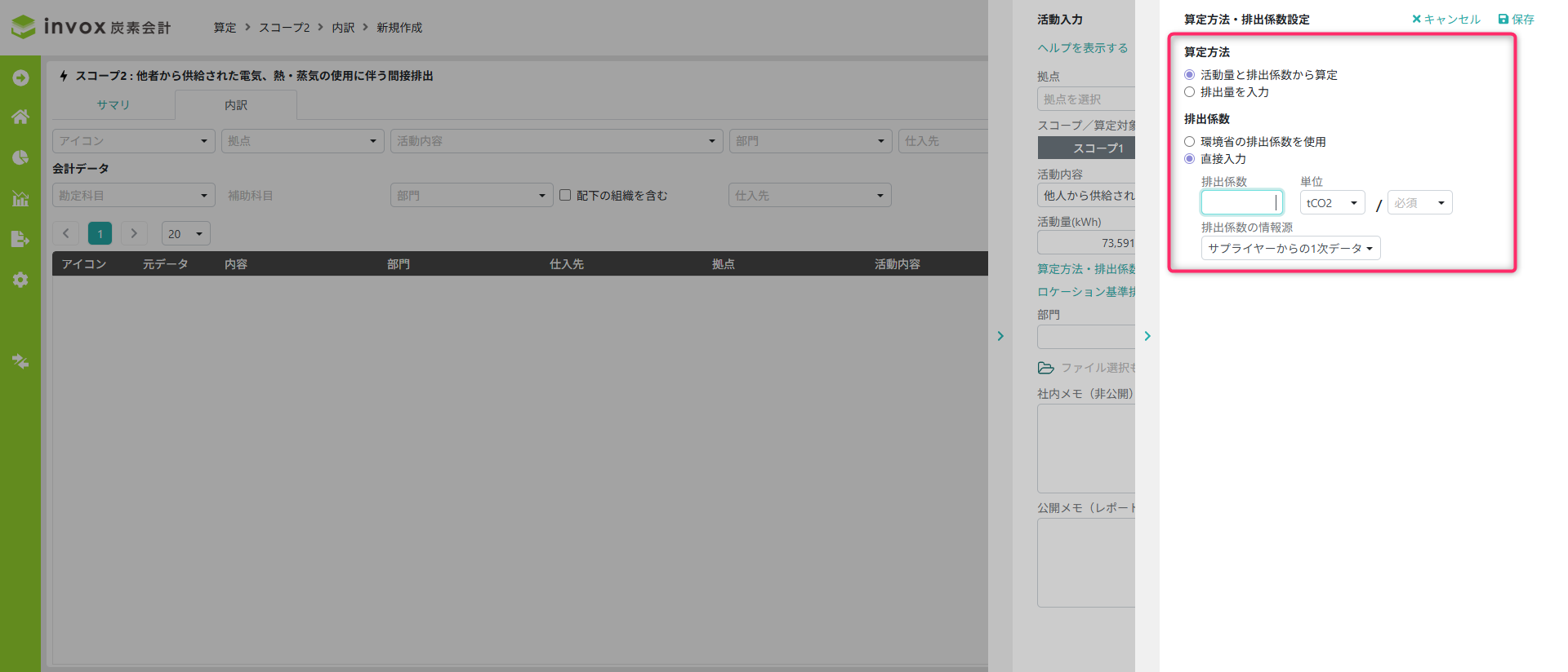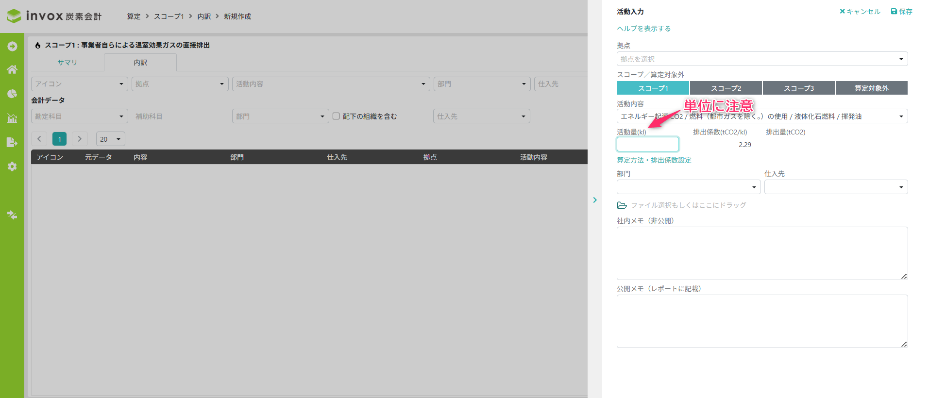 各スコープ、カテゴリ毎に振り分けられたデータに対して活動量や排出量の入力を行います。