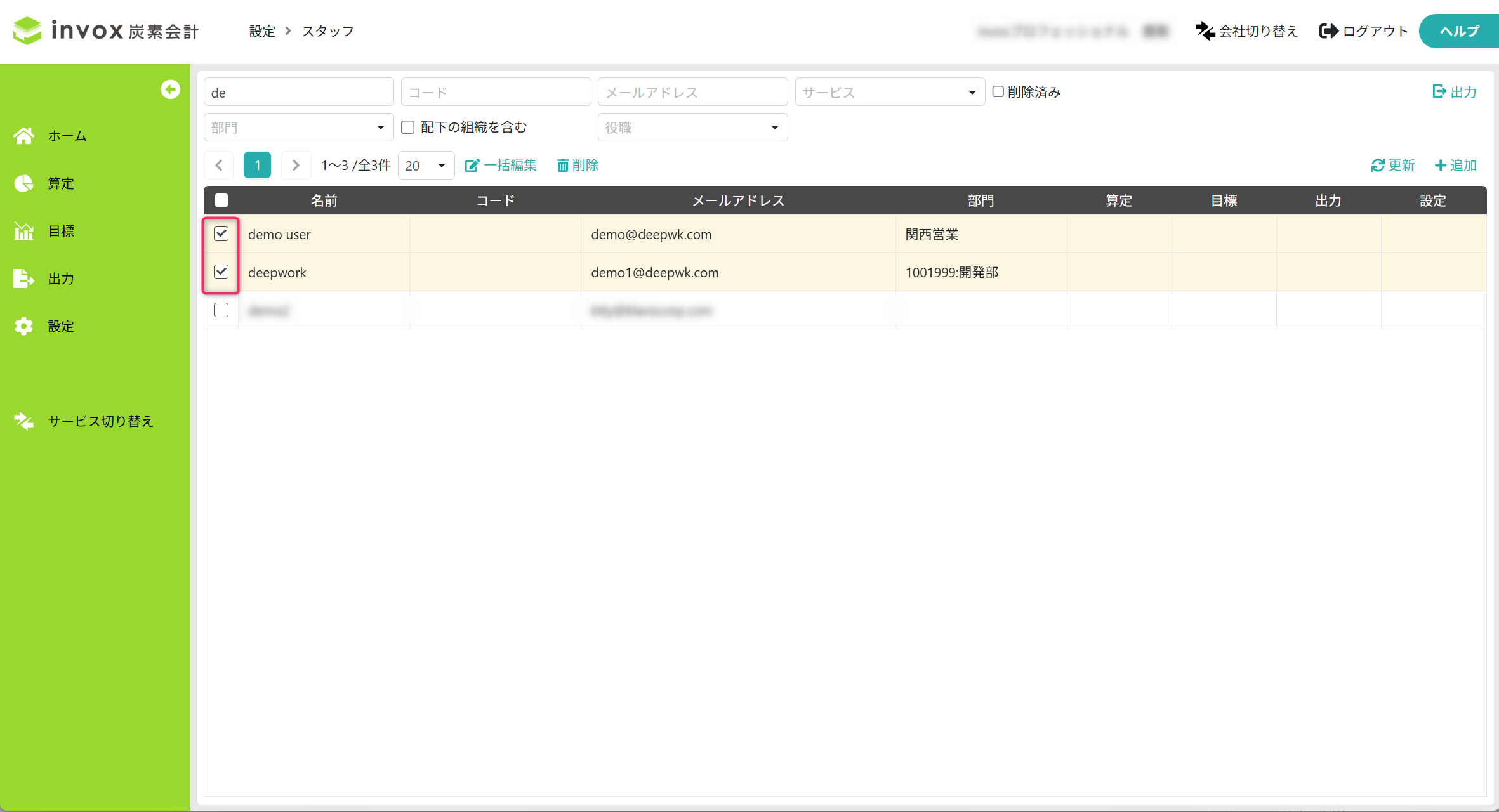 チェックボックスで、変更または削除する対象のスタッフを選択します。