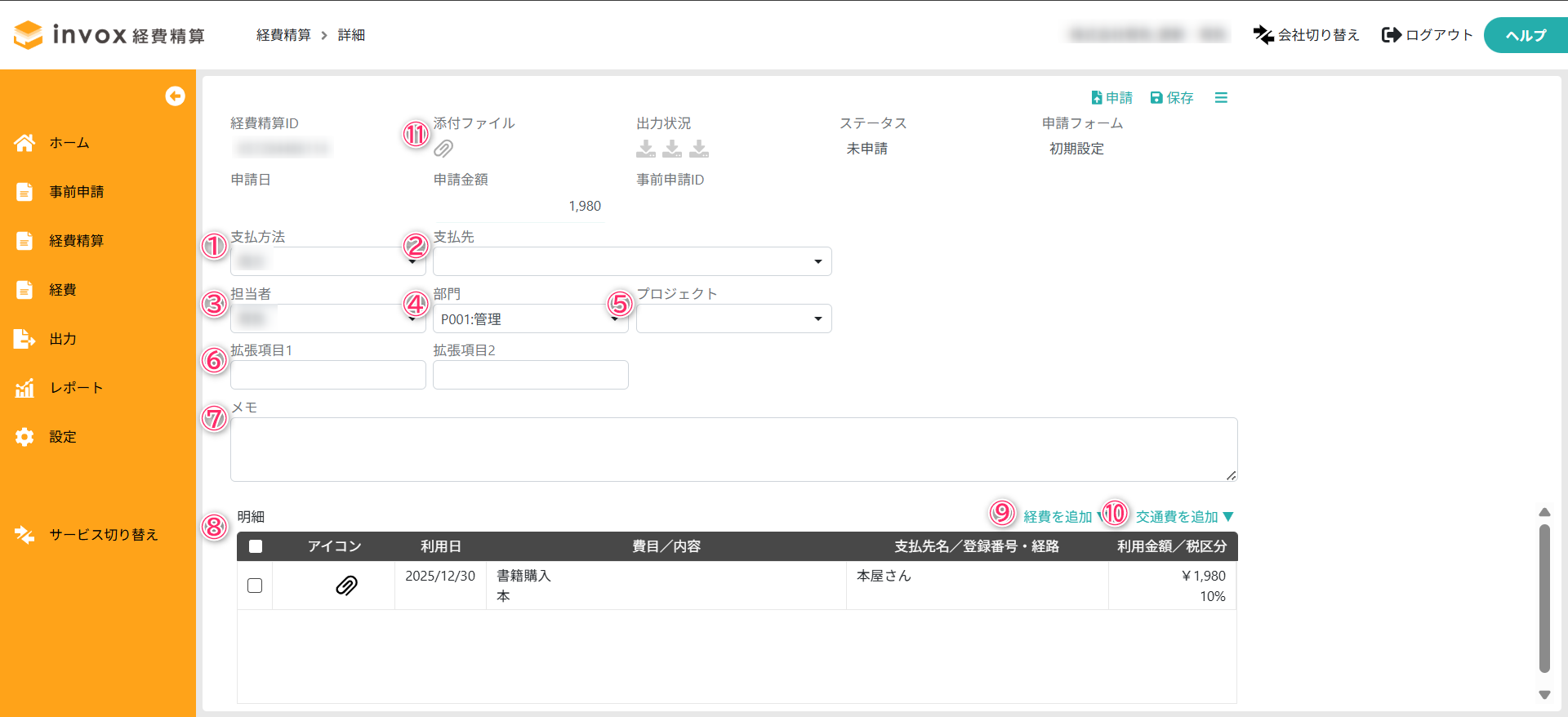 経費精算情報を入力し、一時保存する場合は「保存」を選択し、入力が完了した場合は「申請」を選択して経費精算書を申請します。