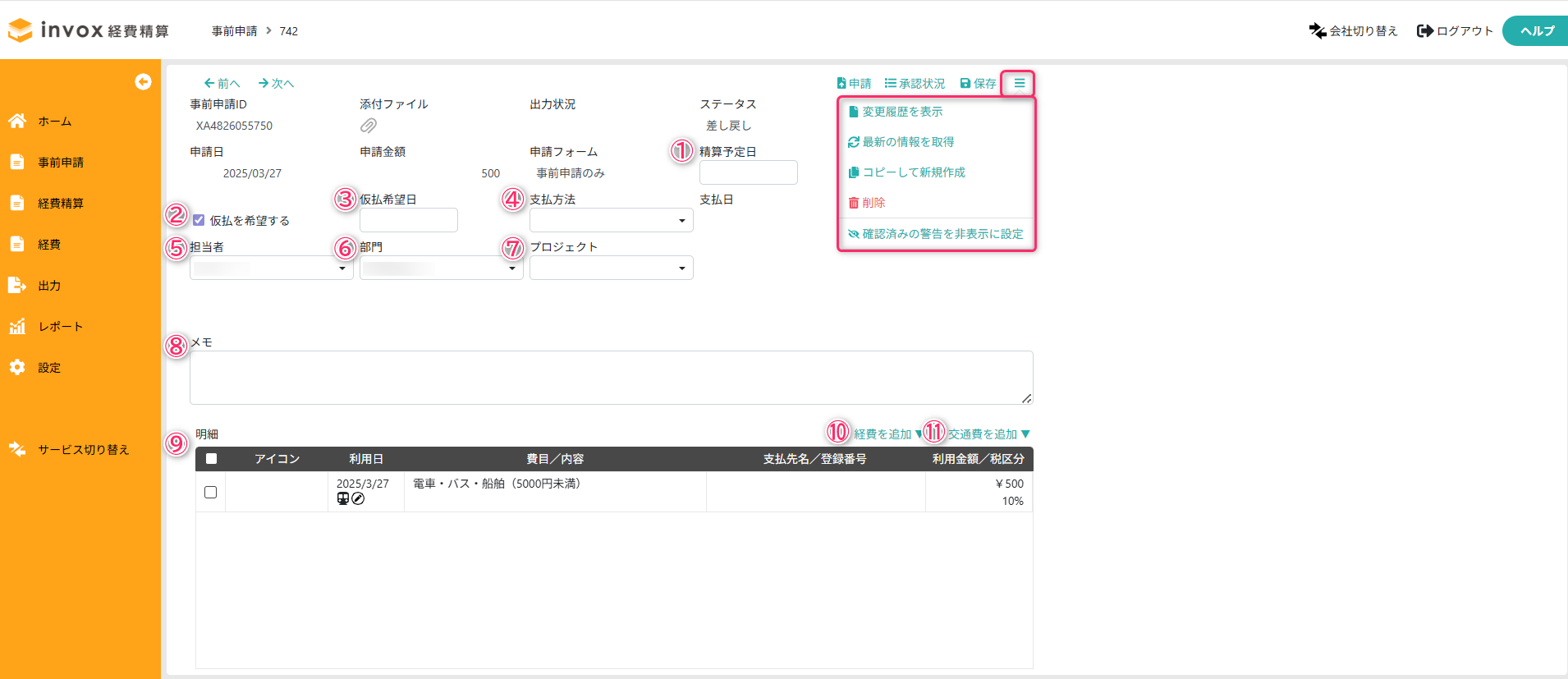 これまでの事前申請書および経費精算書に割り当てられている経費をコピーして明細に追加します。