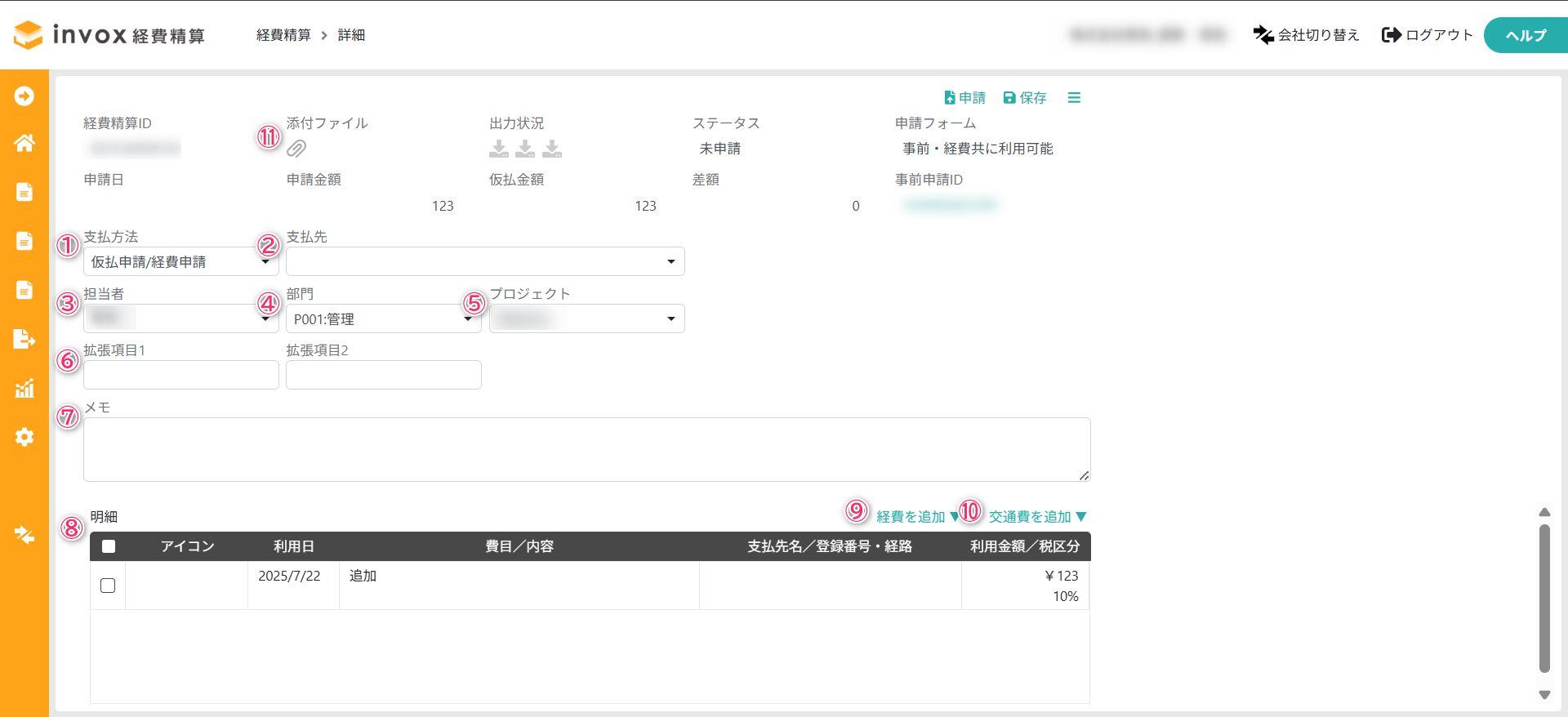 経費精算情報を入力し、一時保存する場合は「保存」を選択し、入力が完了した場合は「申請」を選択して経費精算書を申請します。