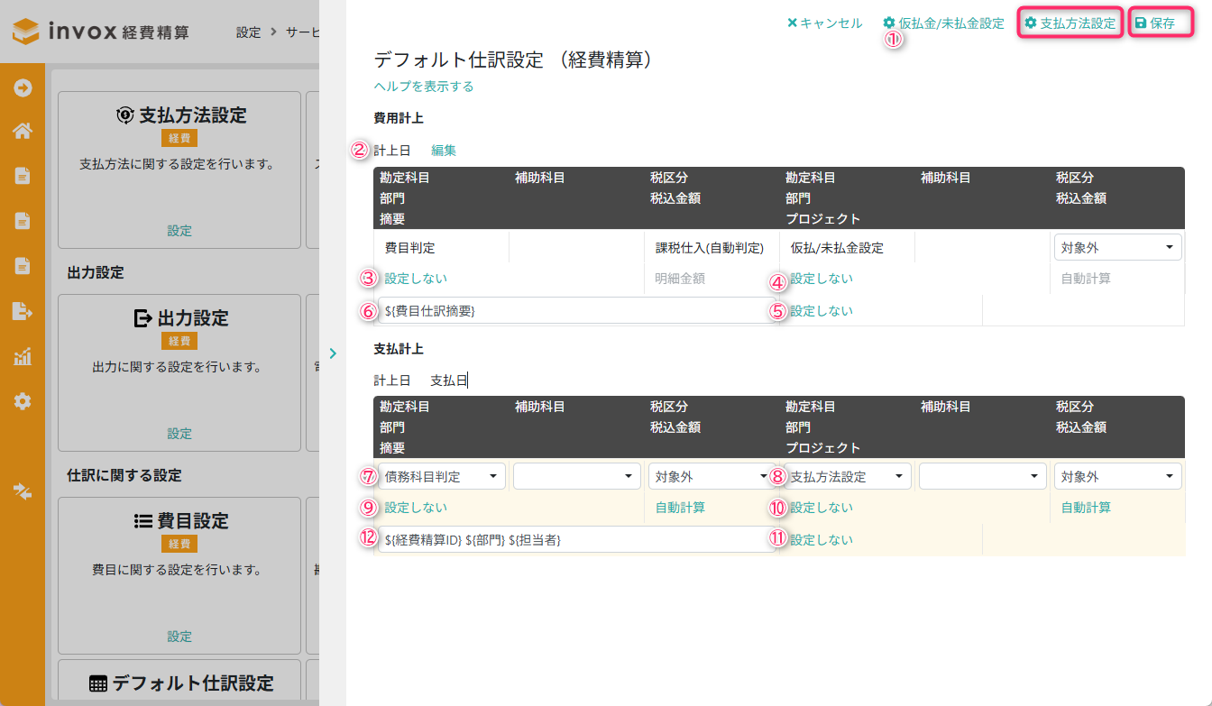 invox経費精算ではデフォルト仕訳設定という仕組みで仕訳を自動生成します。