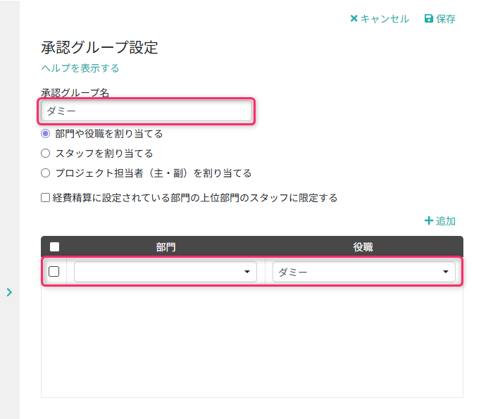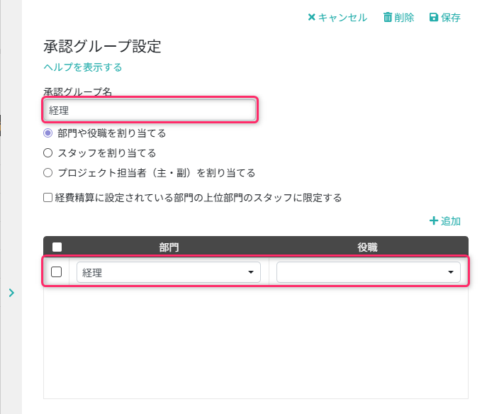 このチェックがOFFの場合、経費精算の部門に関わらず、役職が「上長」である全てのスタッフが承認者となりますが、このチェックをONにすると経費精算の部門に所属する上長のみが承認者となります。
