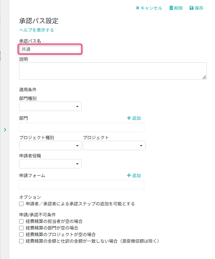 [承認パス名]には任意の文字列を設定できますが、今回はどの経費精算にも共通の承認パスとするため「共通」とします。