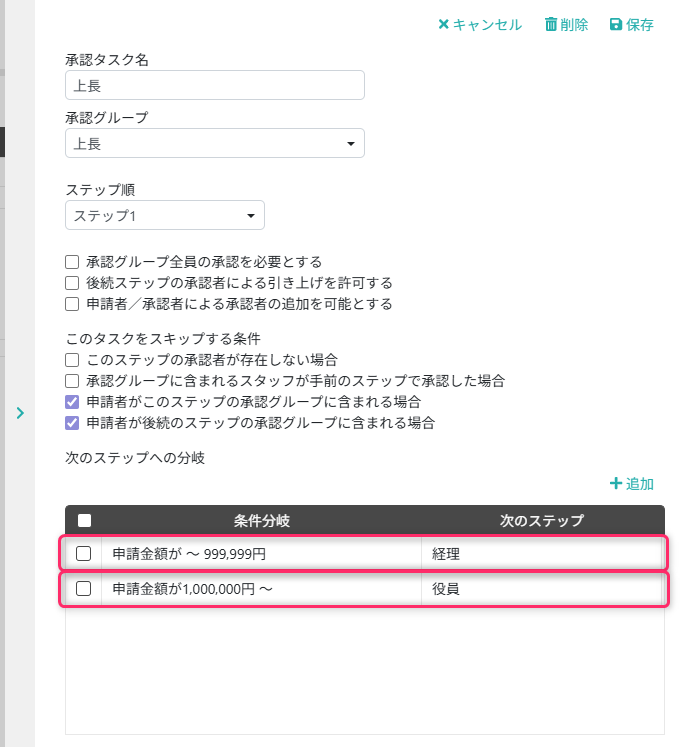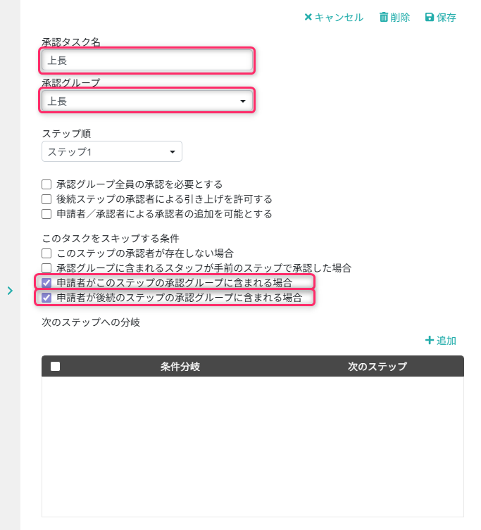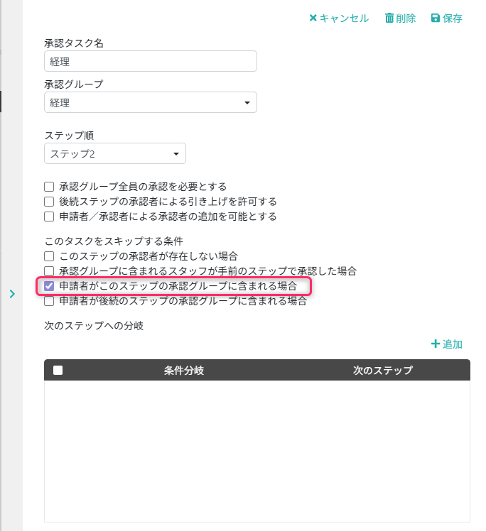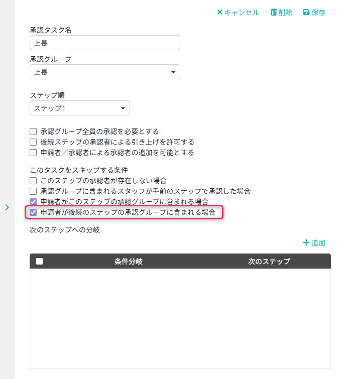 申請者が上長にあたる場合にこの承認ステップをスキップするために[申請者がこのステップの承認グループに含まれる場合]をONにします。
