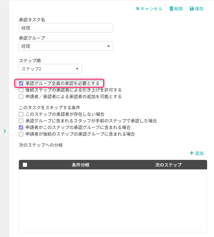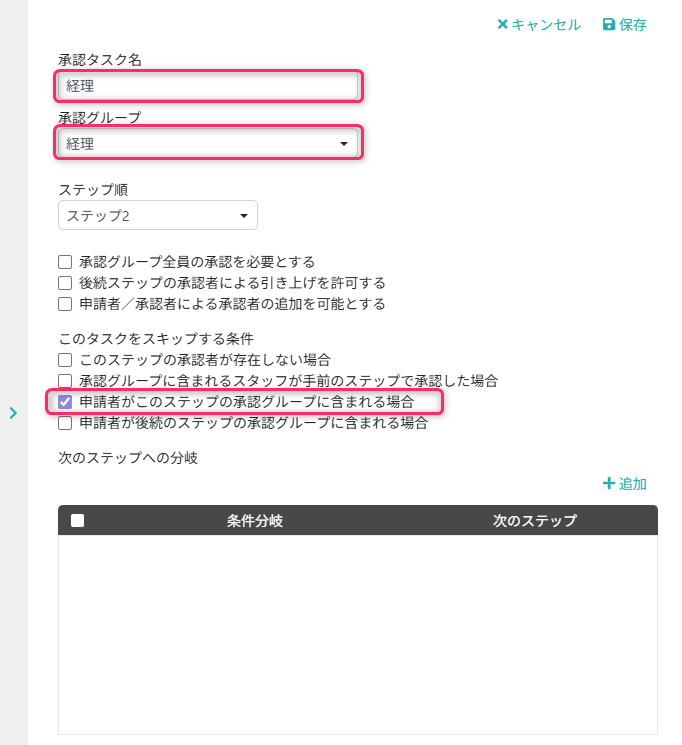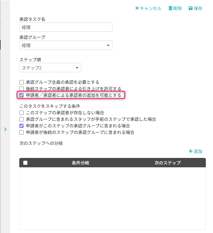 また、申請者が後続の承認ステップである経理担当者である場合にこの承認ステップをスキップするために[申請者が後続のステップの承認グループに含まれる場合]をONにします。