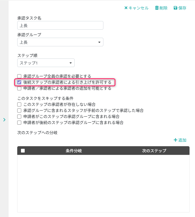 [承認パス設定]の[承認ステップ設定]で「後続ステップの承認者による引き上げを許可する」をONにすることで実現できます。