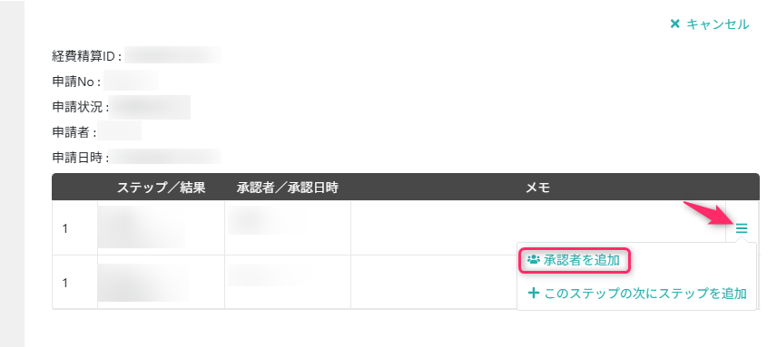 上記設定後、経費精算詳細画面の「承認状況」からスポット承認者を追加することが可能です。