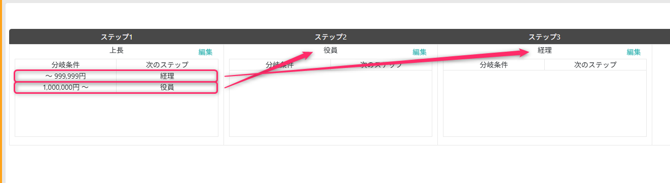 (事前に、ワークフロー例の「上長」ステップの次に「役員」のステップを追加しています。)