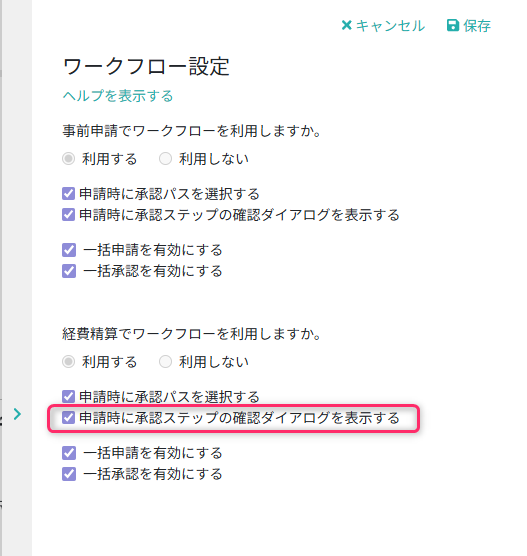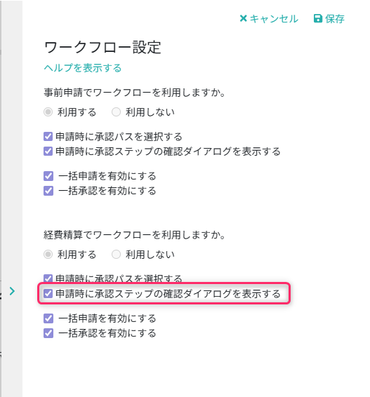 承認ステップは申請後に経費精算詳細画面の「承認状況」から追加できますが、[ワークフロー設定]の「申請時に承認ステップの確認ダイアログを表示する」をONにしておくことで、申請時にも追加できるようになります。