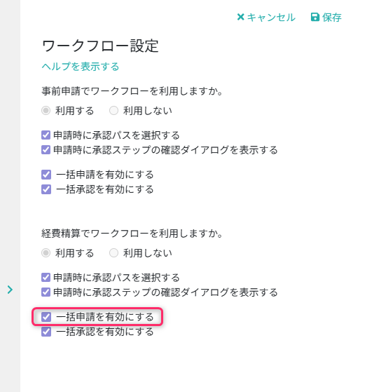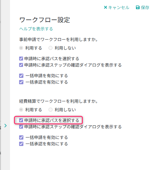 [ワークフロー設定]で「申請時に承認パスを選択する」をONにすることで、経費精算の申請時に承認パスの選択を行えるようになります。