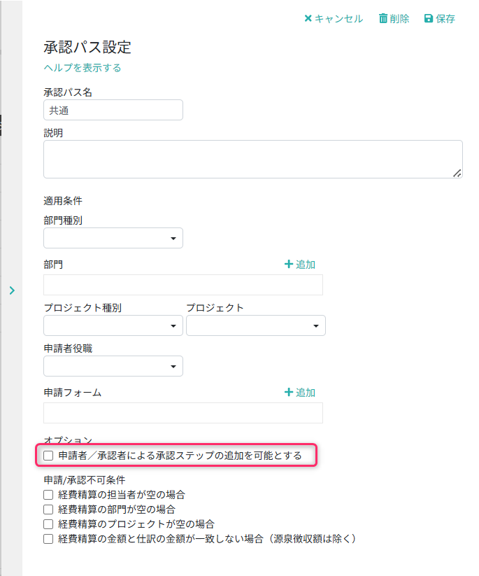 [承認パス設定]の「申請者/承認者による承認ステップの追加を可能とする」をONにすることで実現できます。