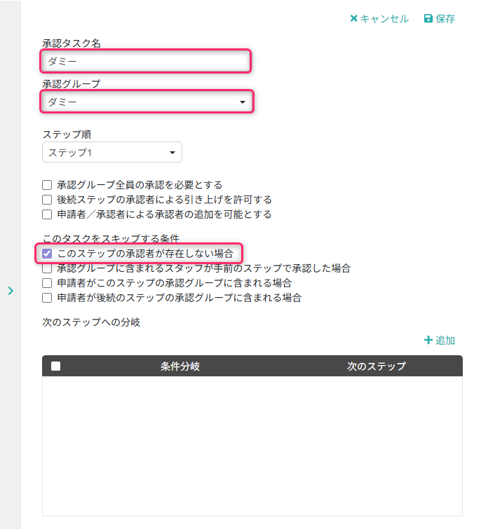 ③承認タスク追加で、承認者がいないダミーの承認グループを設定し、「このステップの承認者が存在しない場合」をONにします。