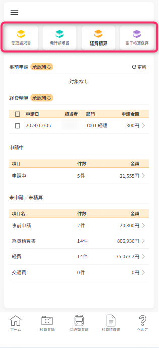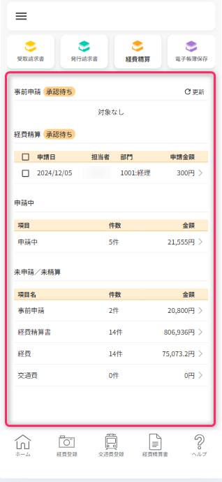 アプリへログイン後、承認待ちの事前申請・経費精算データの一覧、ログイン者自身の申請中データの一覧と未精算データが表示されています。