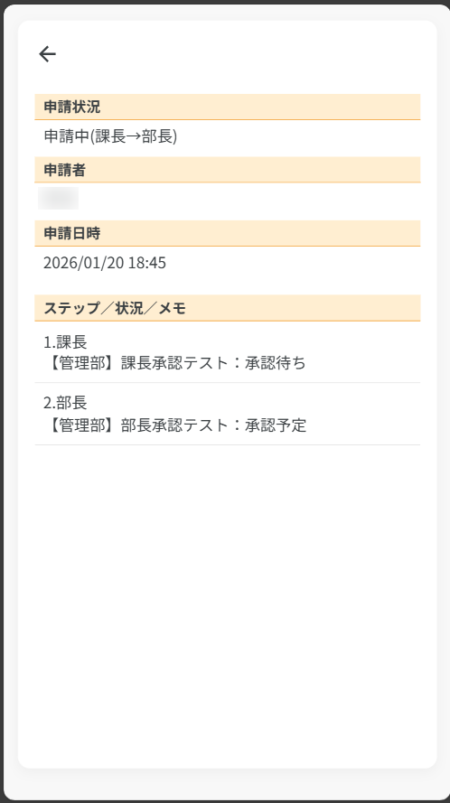 申請中のデータには申請状況が表示され、タップすると承認状況が表示されます。