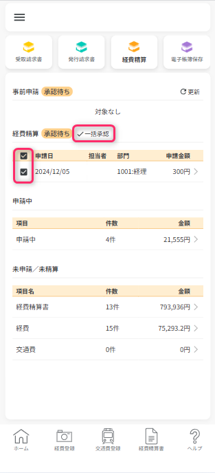 未申請/未精算一覧から「申請中」の行をタップすると、ログインスタッフが担当者でステータス「承認待ち」となっている経費精算データの一覧が表示されます。