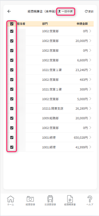 ワークフロー設定で「一括申請を有効にする」がONの場合、チェックボックスが表示され、選択すると「一括申請」が可能です。