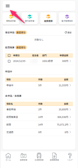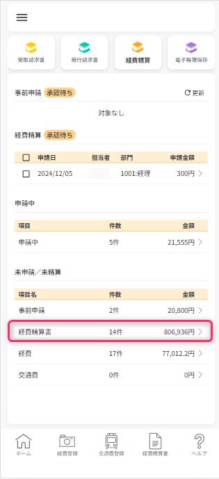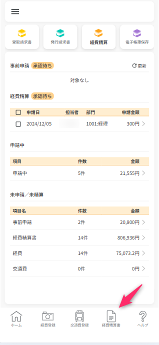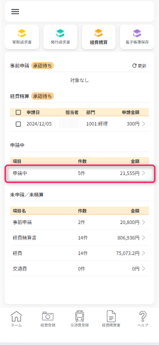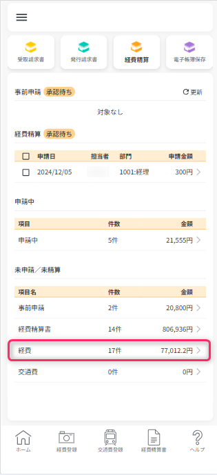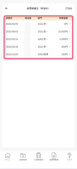 未申請/未精算一覧から「経費」の行をタップすると、登録された経費データの一覧が表示されます。