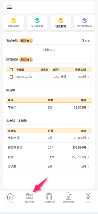 アプリへログイン後、画面下部の「経費登録」アイコンをタップします。