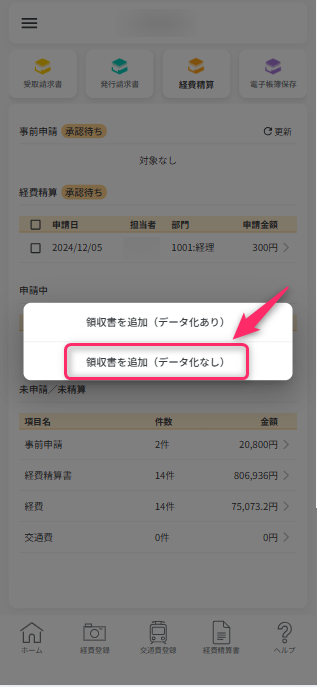 領収書画像なしでも経費データの登録ができます。