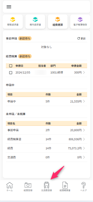 未申請/未精算一覧から「交通費」の行をタップすると、登録された交通費データの一覧が表示されます。