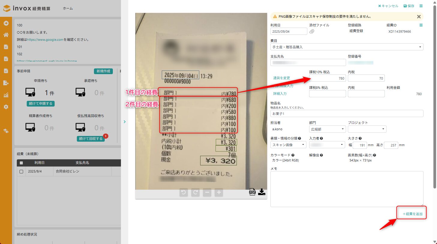 経費の登録画面で右下にある「+経費を追加」リンクをクリックする事で1枚の領収書から複数件の経費を登録する事が可能です。