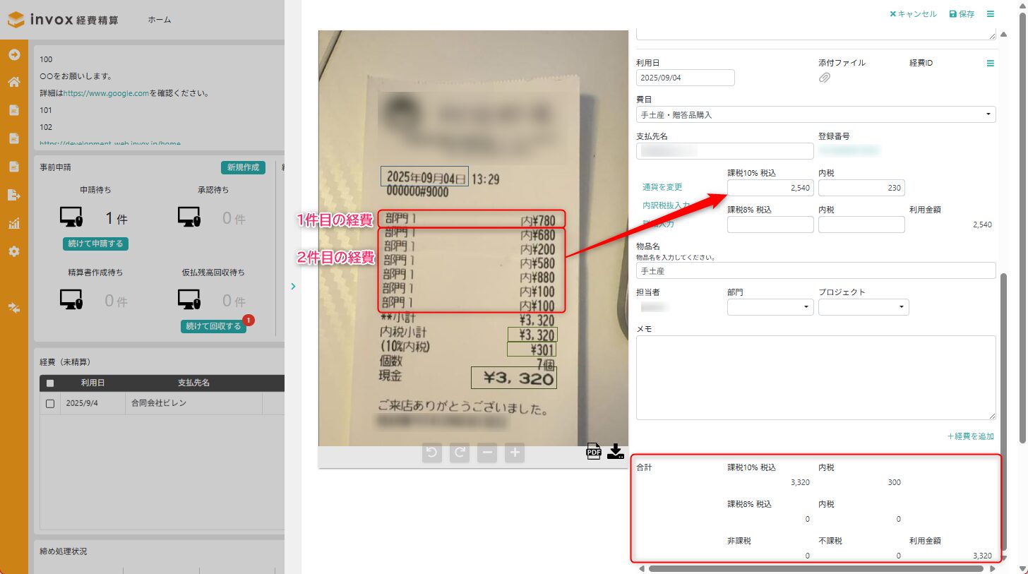 領収書をアップロードし、データ化後に経費内容を入力します。