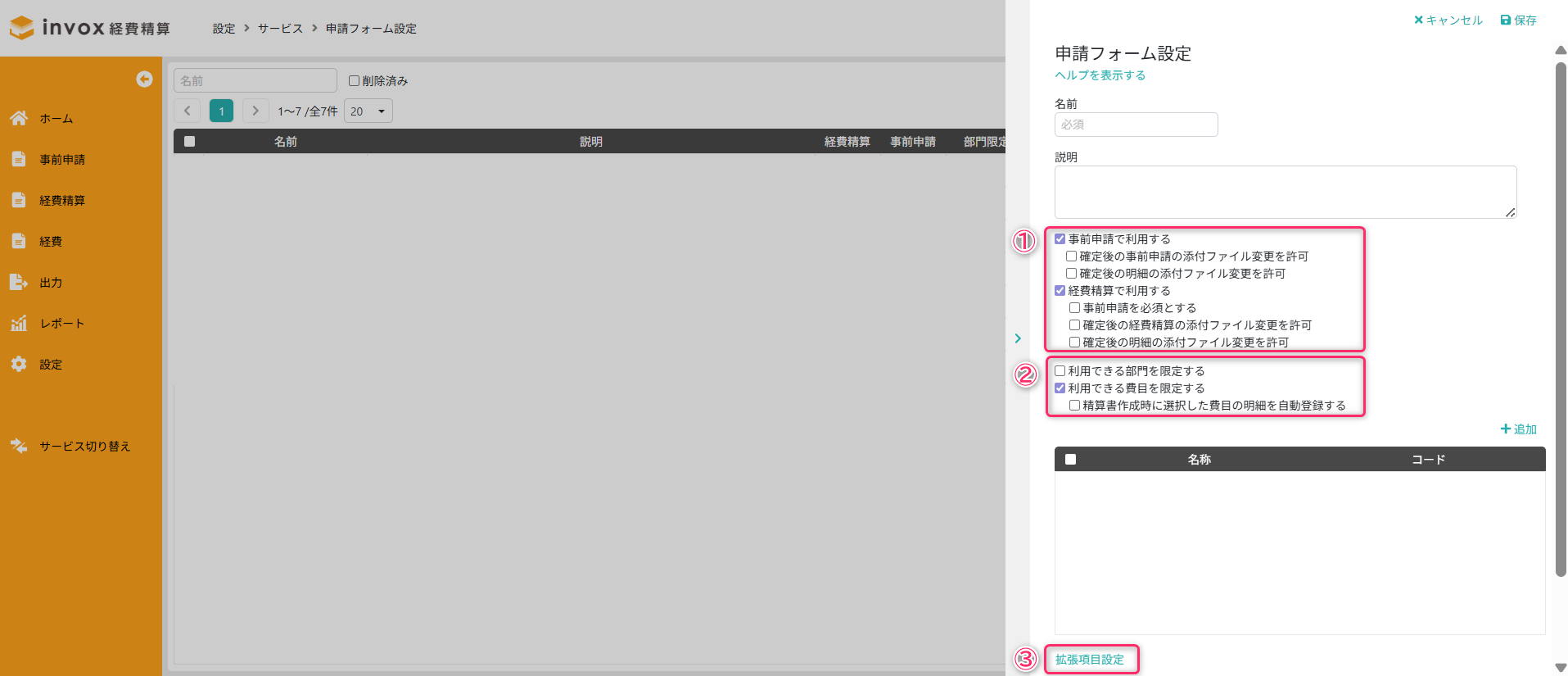 invox経費精算の申請フォーム設定は、事前申請や経費精算の種類によって申請内容(部門、費目)を制限できる機能です。