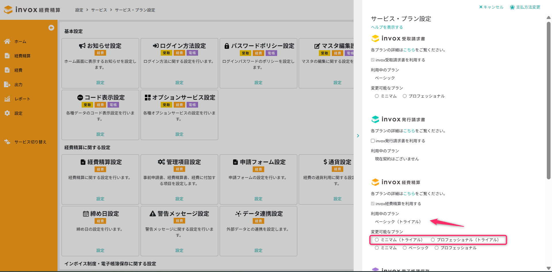 サービス・プラン設定ではinvoxのサービス申込やプラン変更、支払方法の変更が可能です。