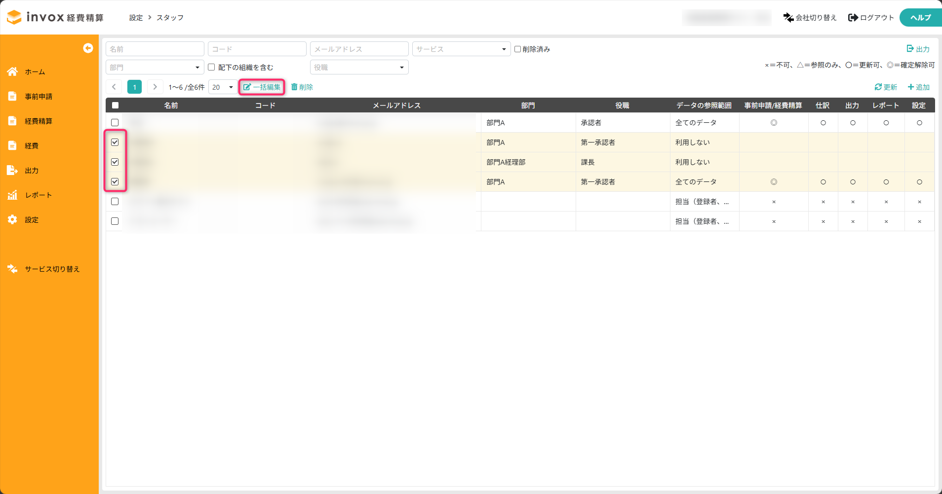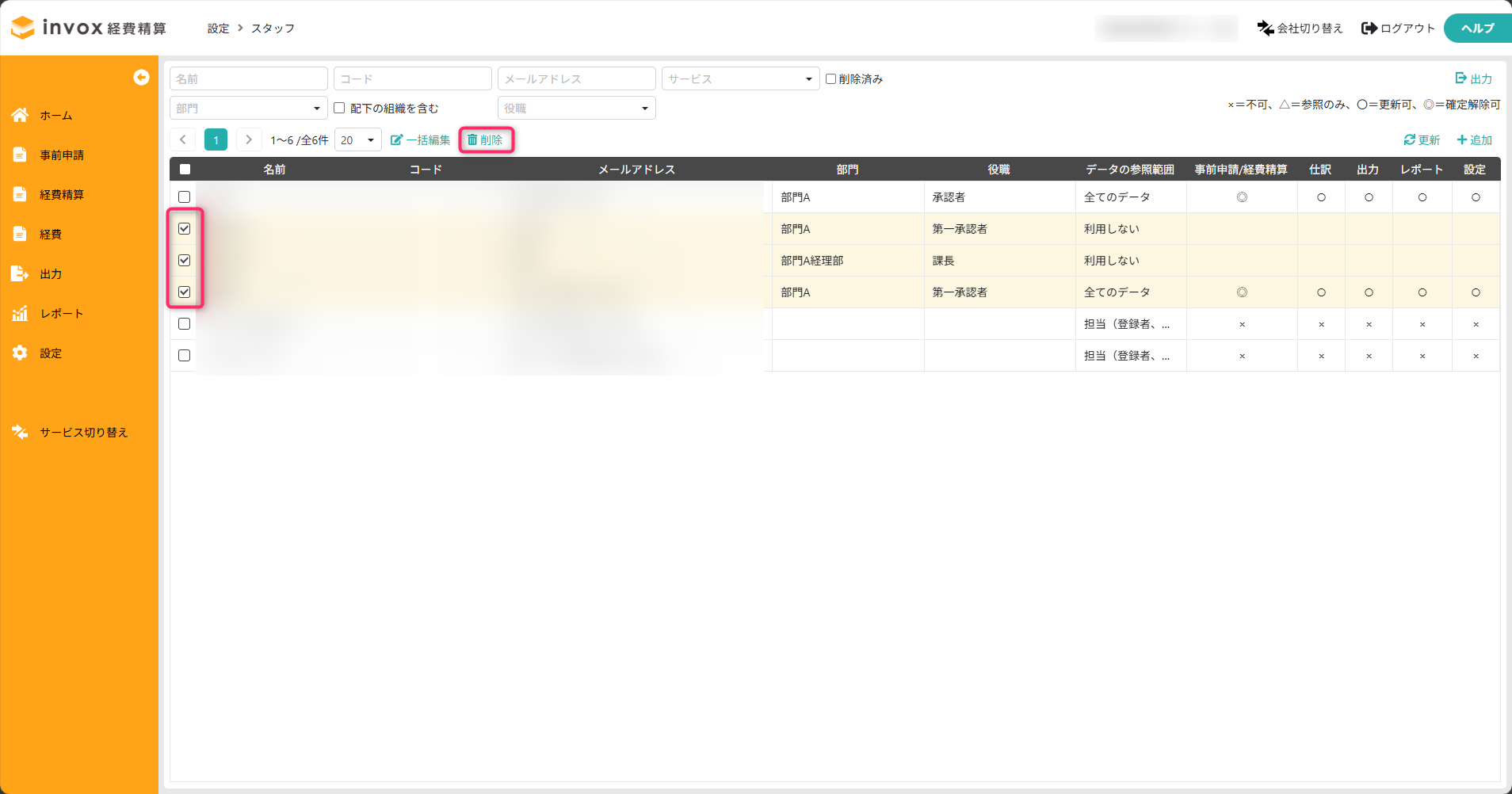 行の先頭のチェックボックスにチェックをすると、操作ボタンが一覧の上に表示され、複数のスタッフを一括操作できます。