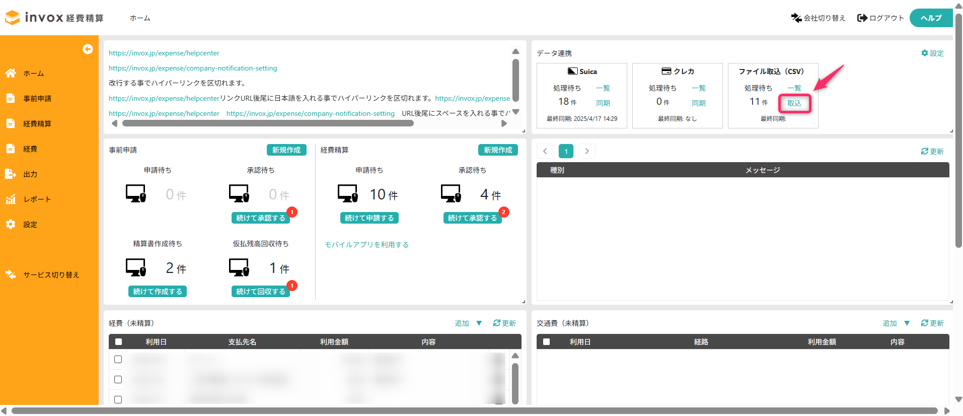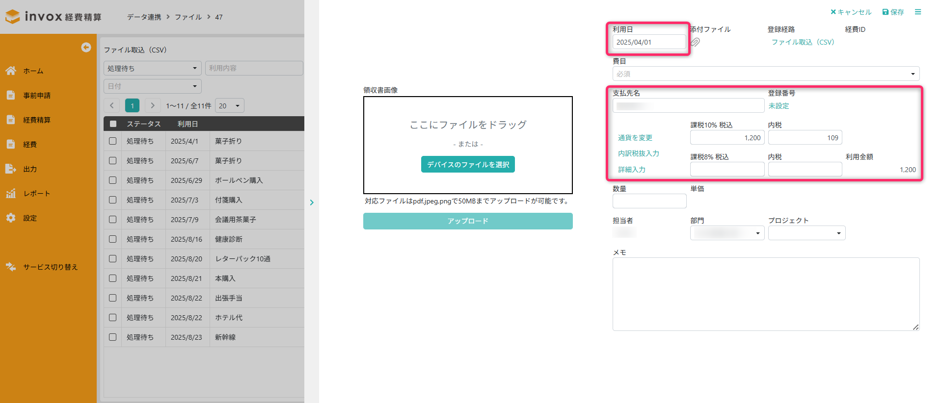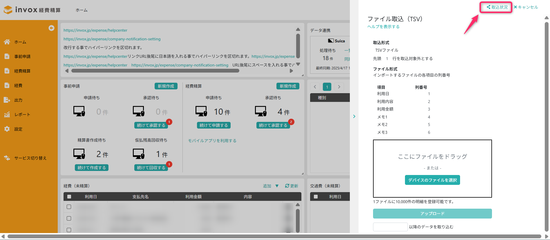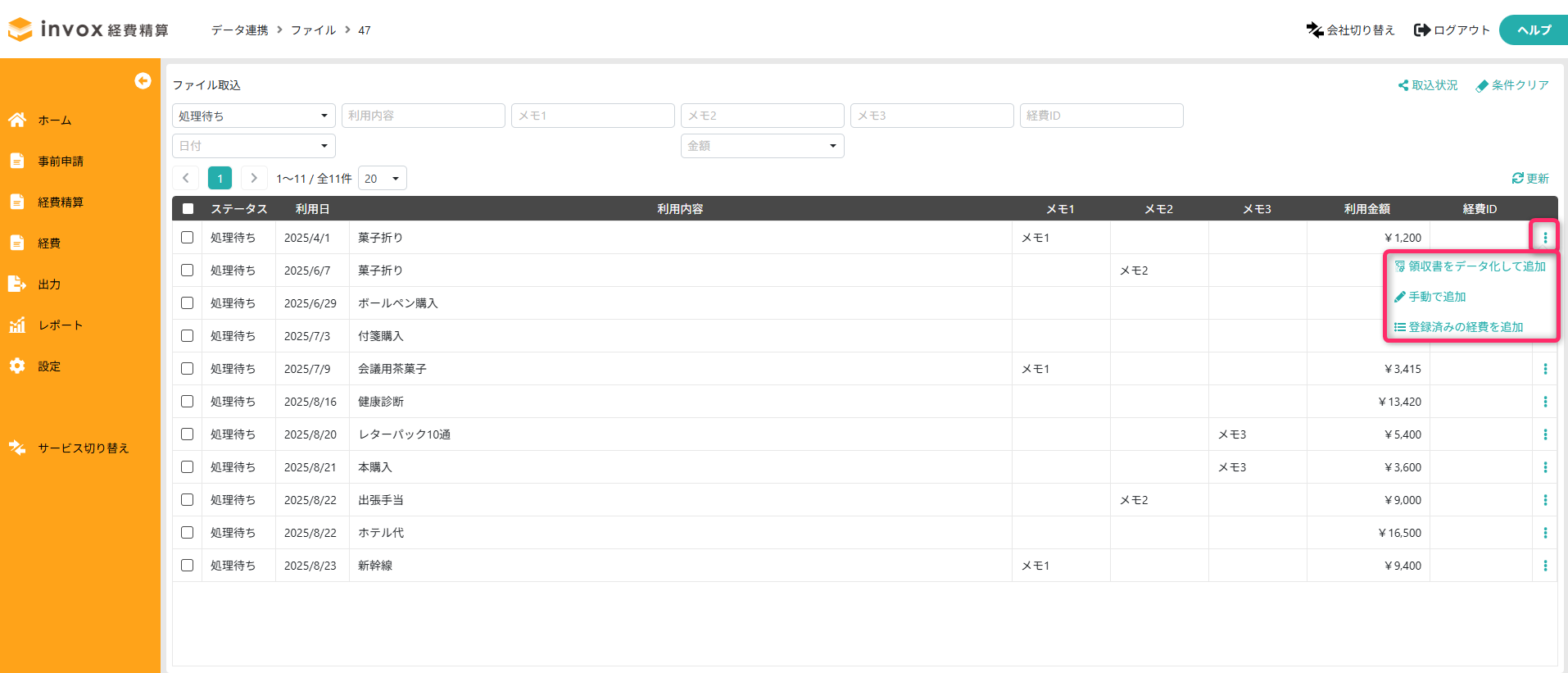 invox経費精算は、データ連携機能を利用してCSVファイルやTSVファイルを取り込み、経費データとして登録できます。