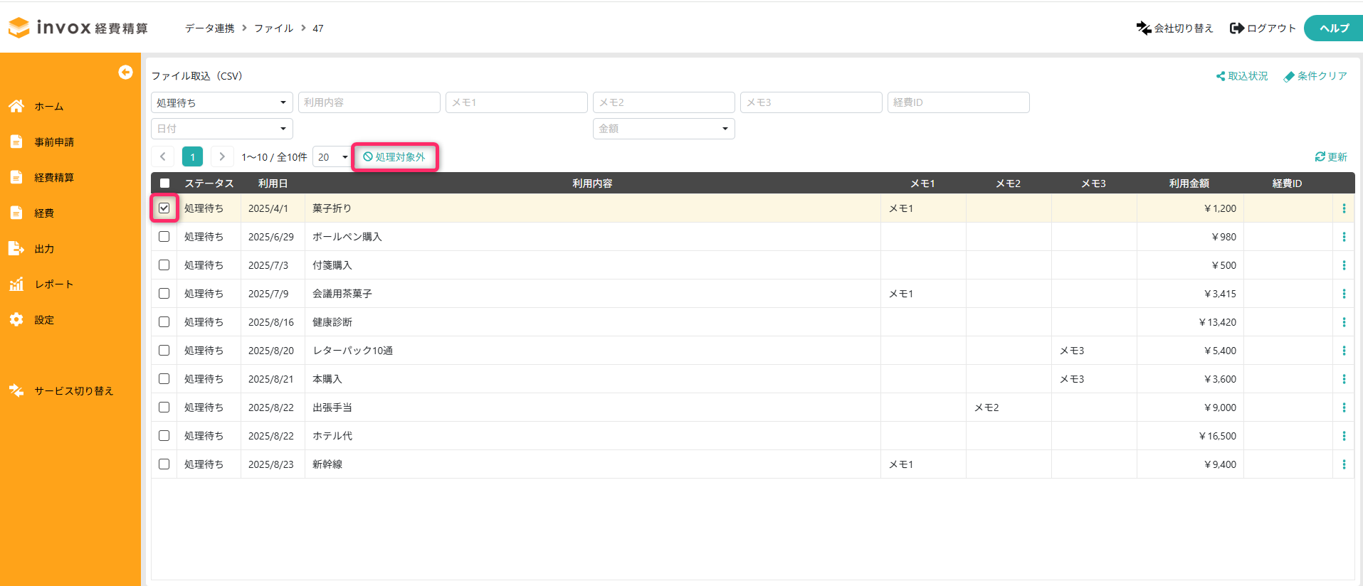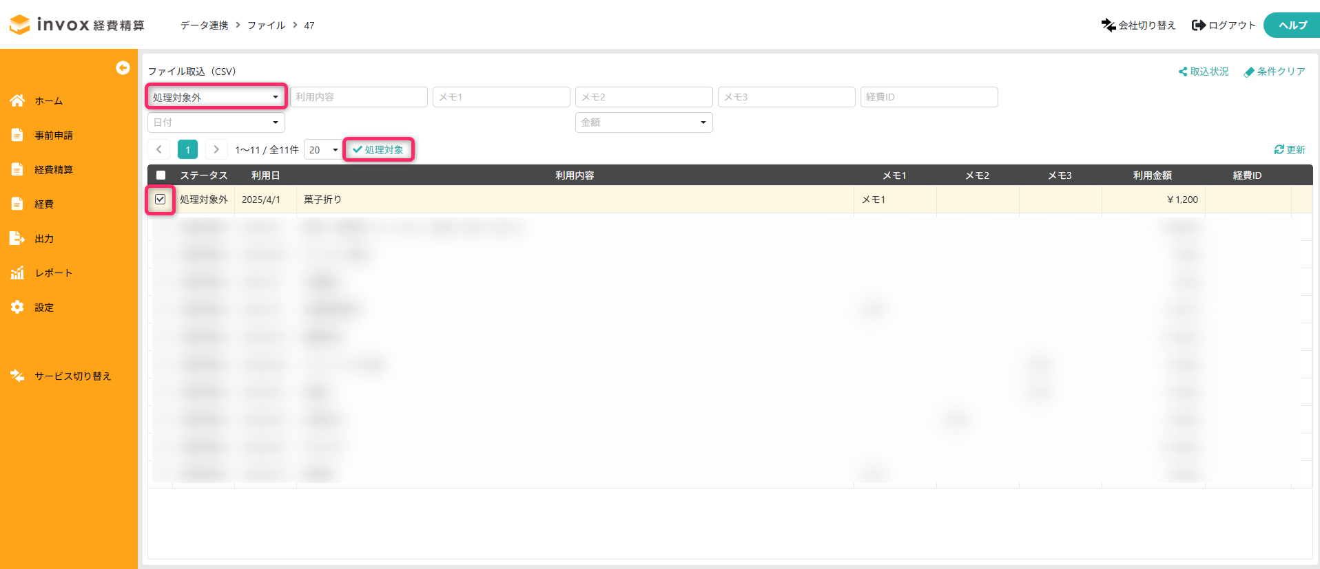 経費として登録したくない利用情報は、一覧でその行を選択して「処理対象外」をクリックしてください。