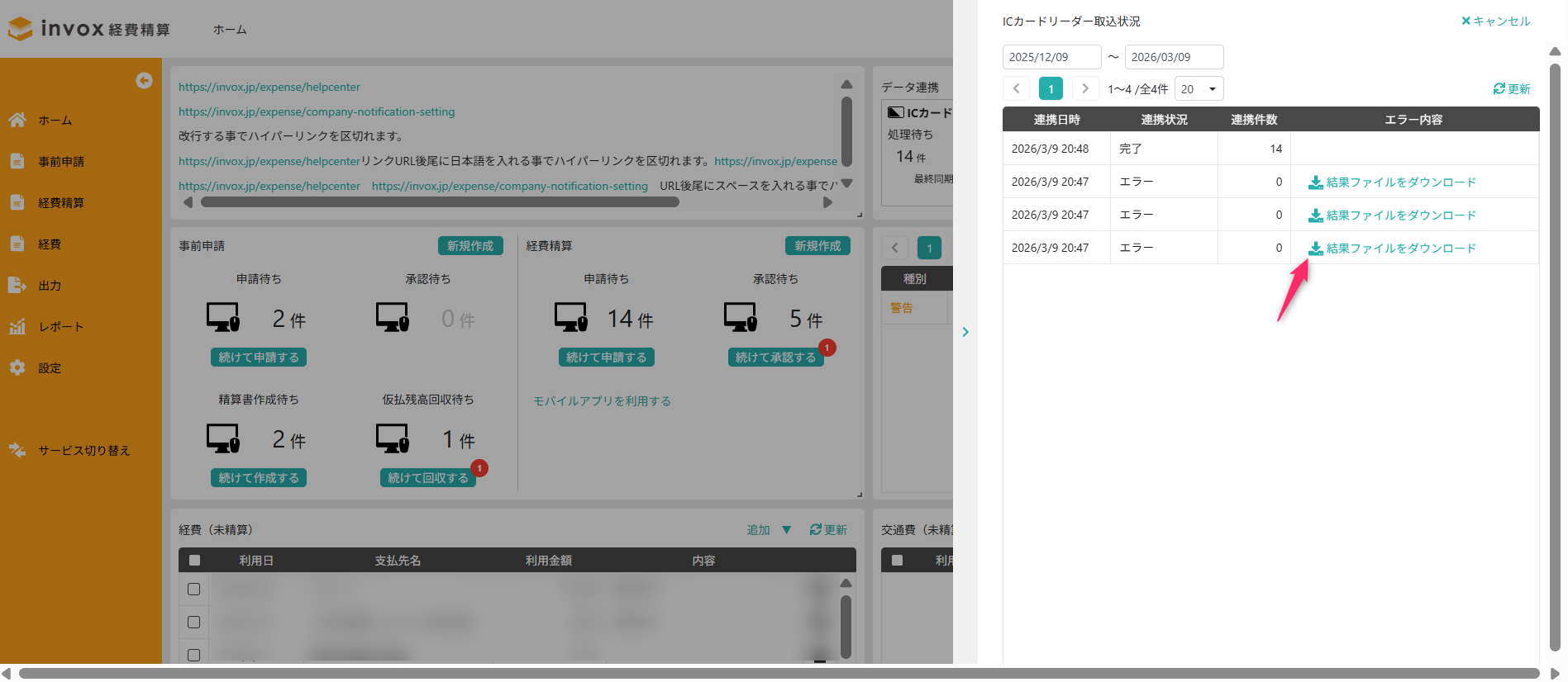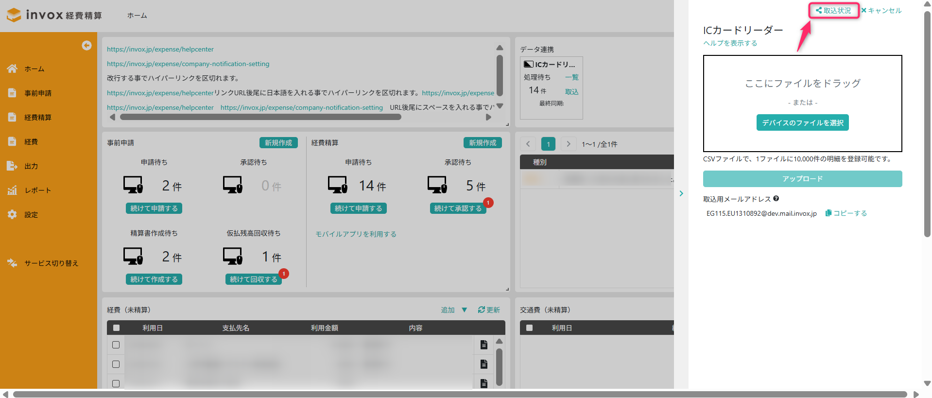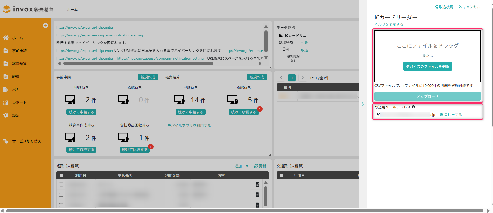 invox経費精算は、外部データ連携機能を利用して、ICカードリーダーアプリから出力したCSVファイルを取り込み、経費データとして登録できます。