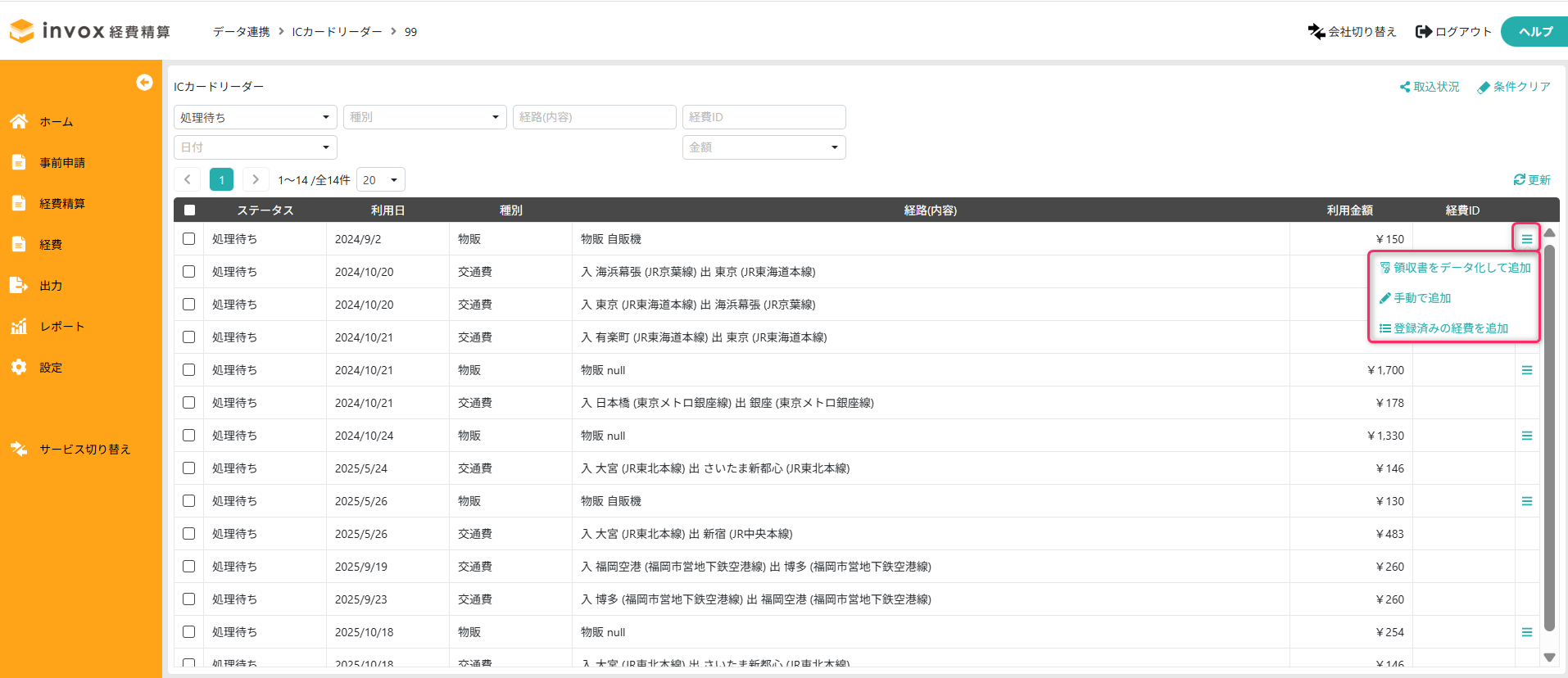 対象行の右端のメニューをクリックして、その利用情報を経費として登録する、または登録済みの経費と関連付けることができます。