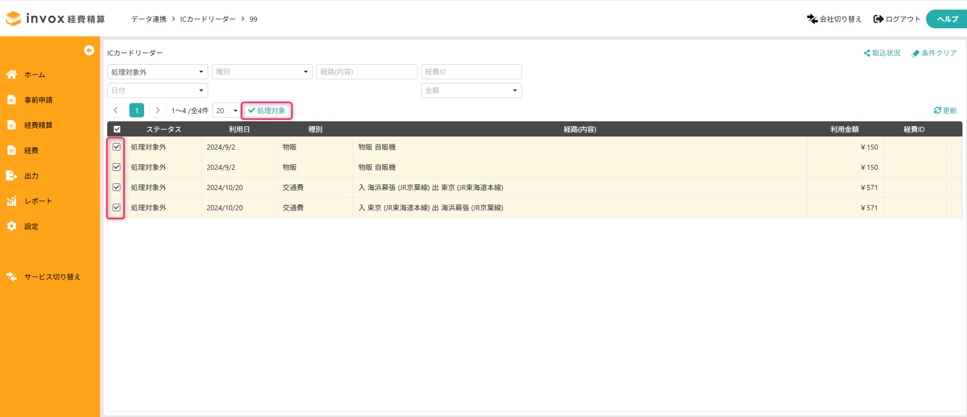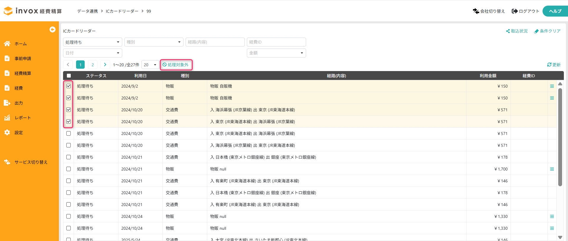 一覧に交通費/経費として登録したくないデータがある場合は、一覧で選択して「処理対象外」をクリックしてください。