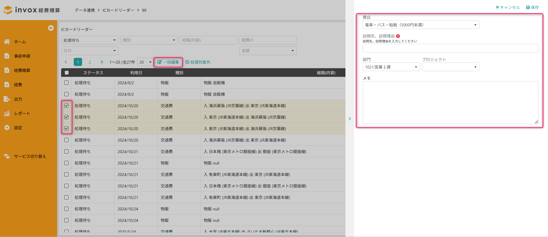 ステータスが「処理待ち」で種別が「交通費」のデータは、一覧で選択して一括編集できます。