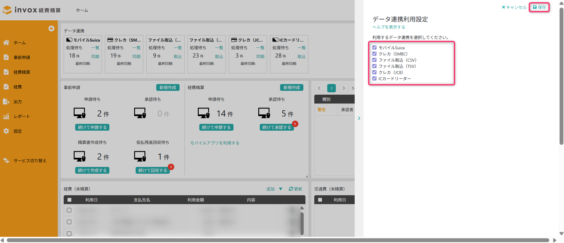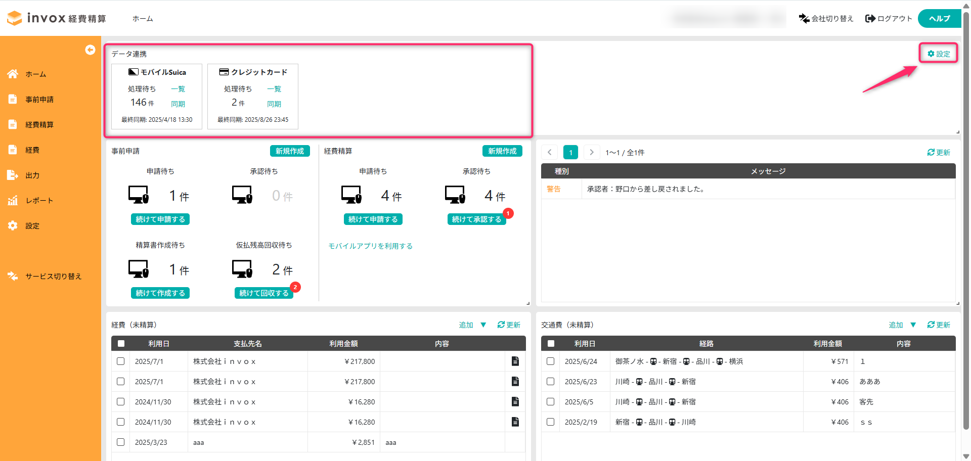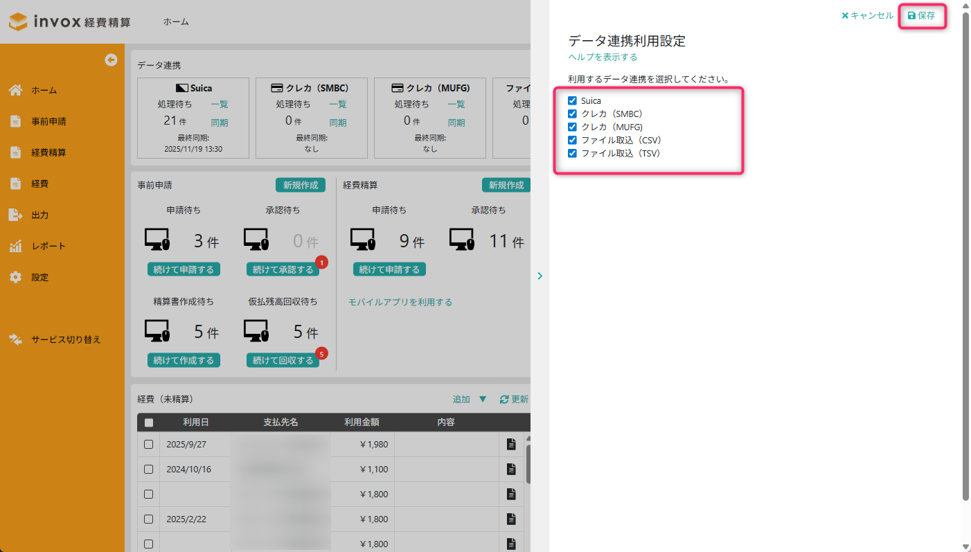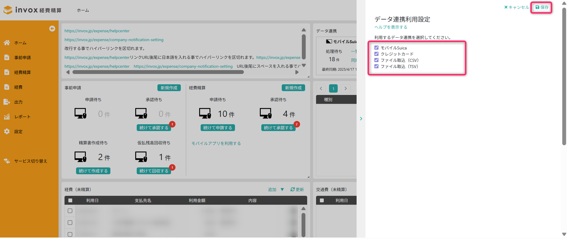 invox経費精算で、外部データとのデータ連携設定がされている場合、スタッフが自分のホーム画面で利用したいデータ連携を追加できます。