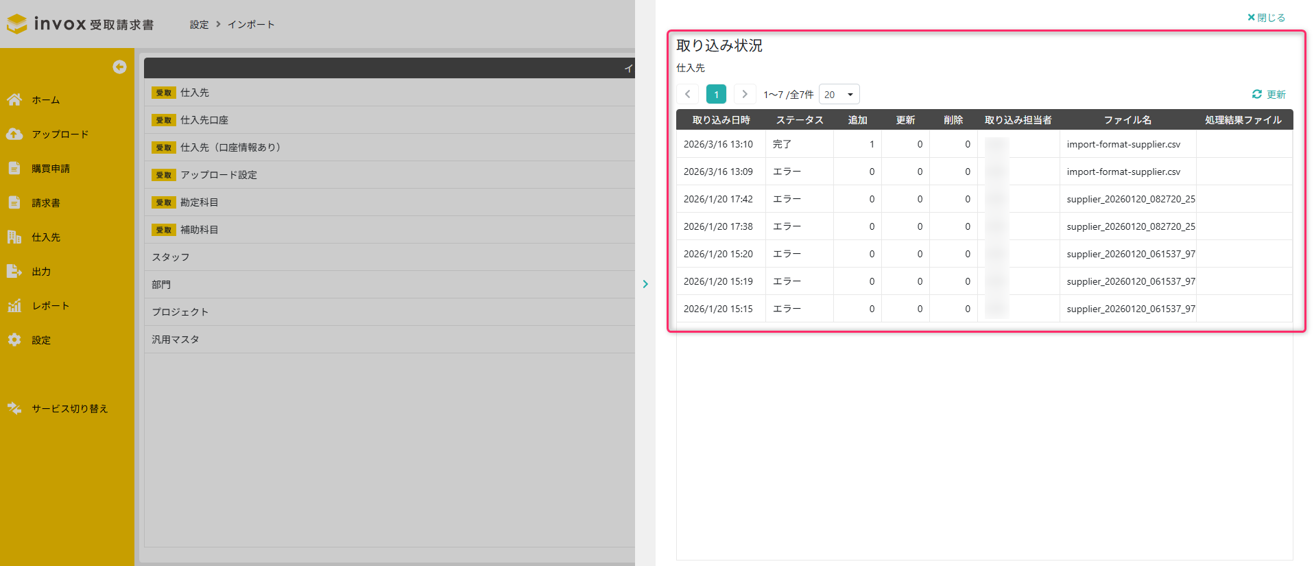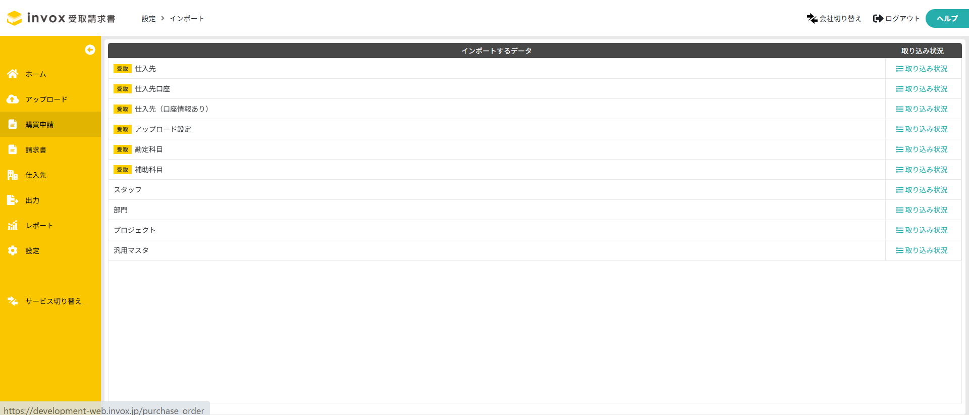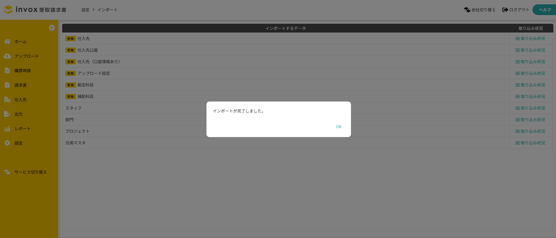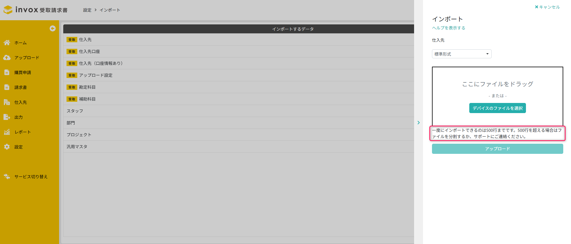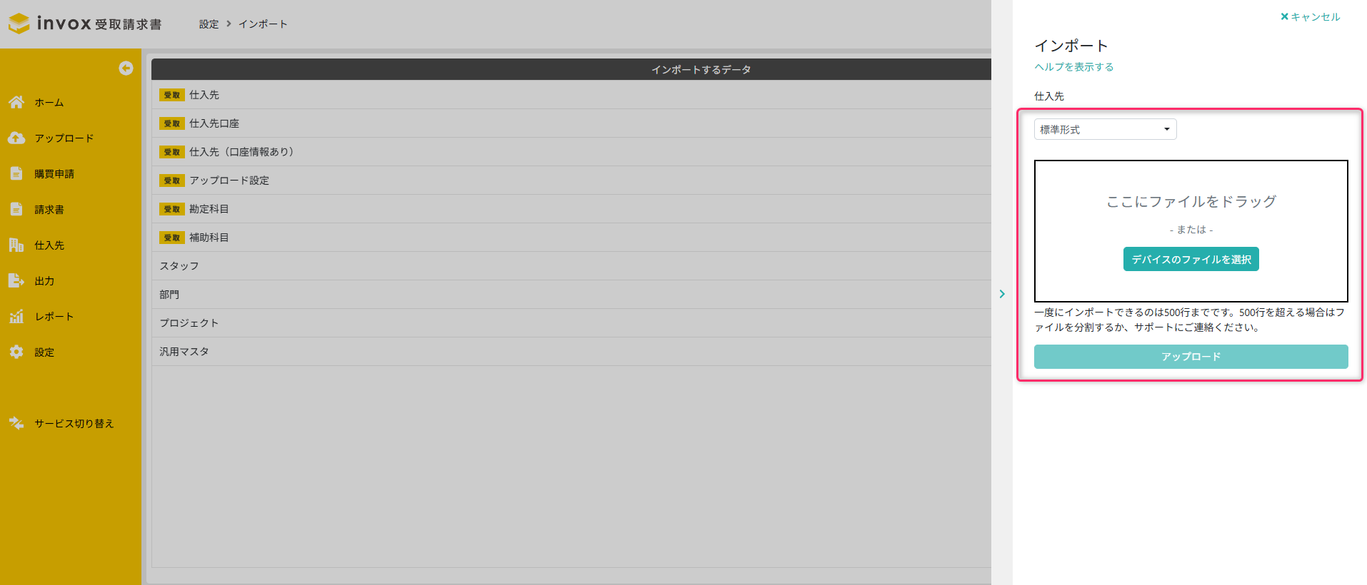 invox受取請求書における、マスタのインポート方法は以下のステップで行います。