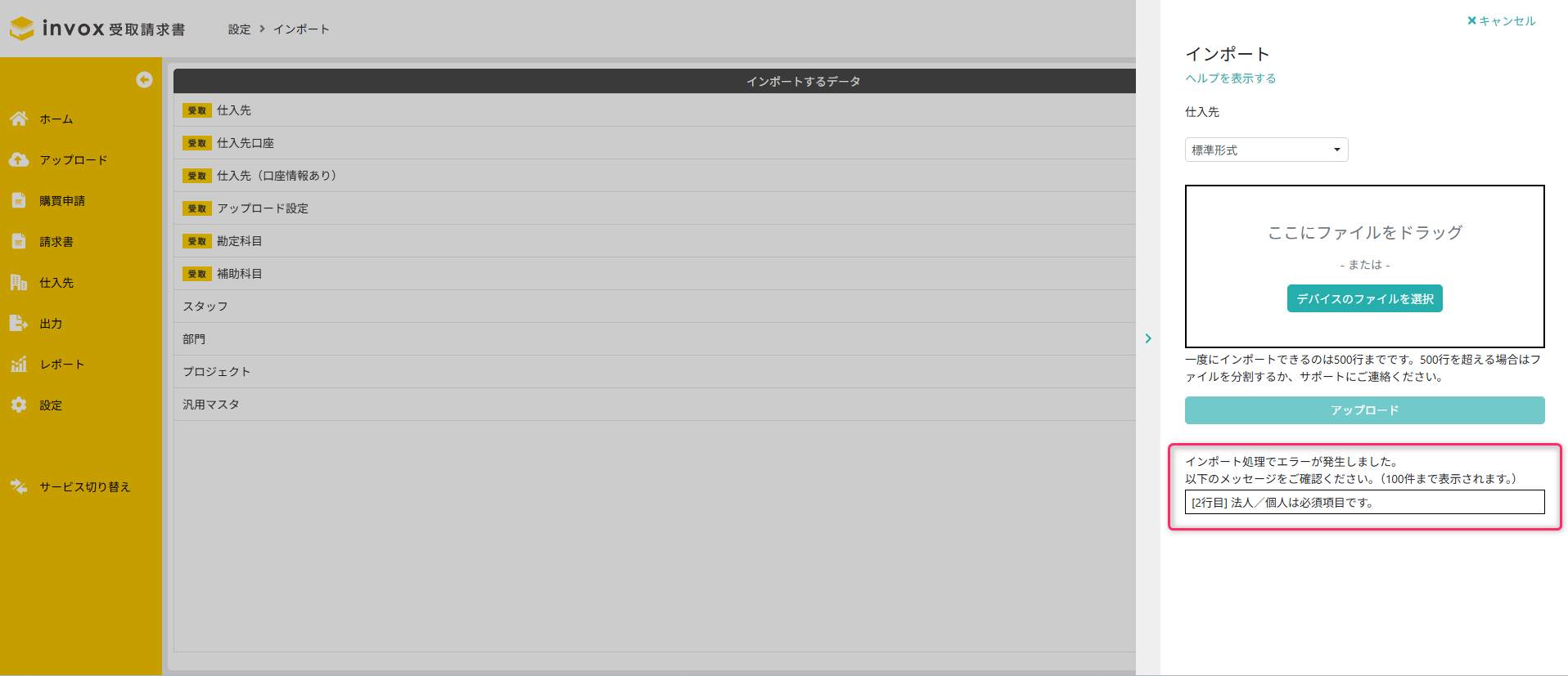 ファイル選択後、インポートするデータにエラーがある場合、エラー内容が表示されます。