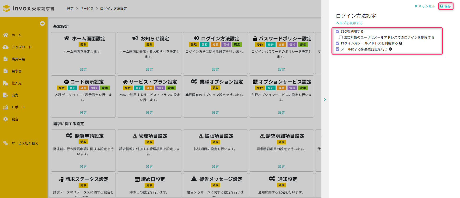 メニュー[設定]-[サービス]-[ログイン方法設定]から設定画面を開きます。