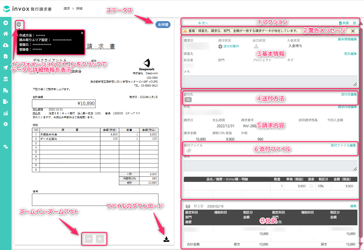 請求データの詳細画面では、左側に請求書テンプレート設定で設定したレイアウトから生成されるPDFのプレビュー画像、右側に請求データの内容が表示されます。