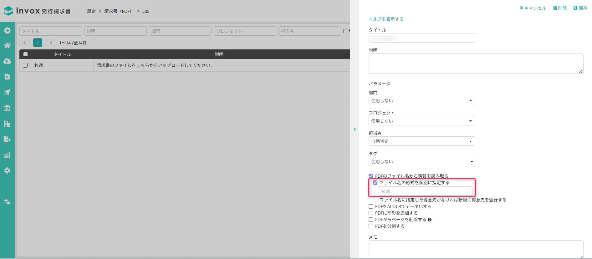 ファイル名からの情報の読み取りは請求書(PDF)取込設定をご覧ください。