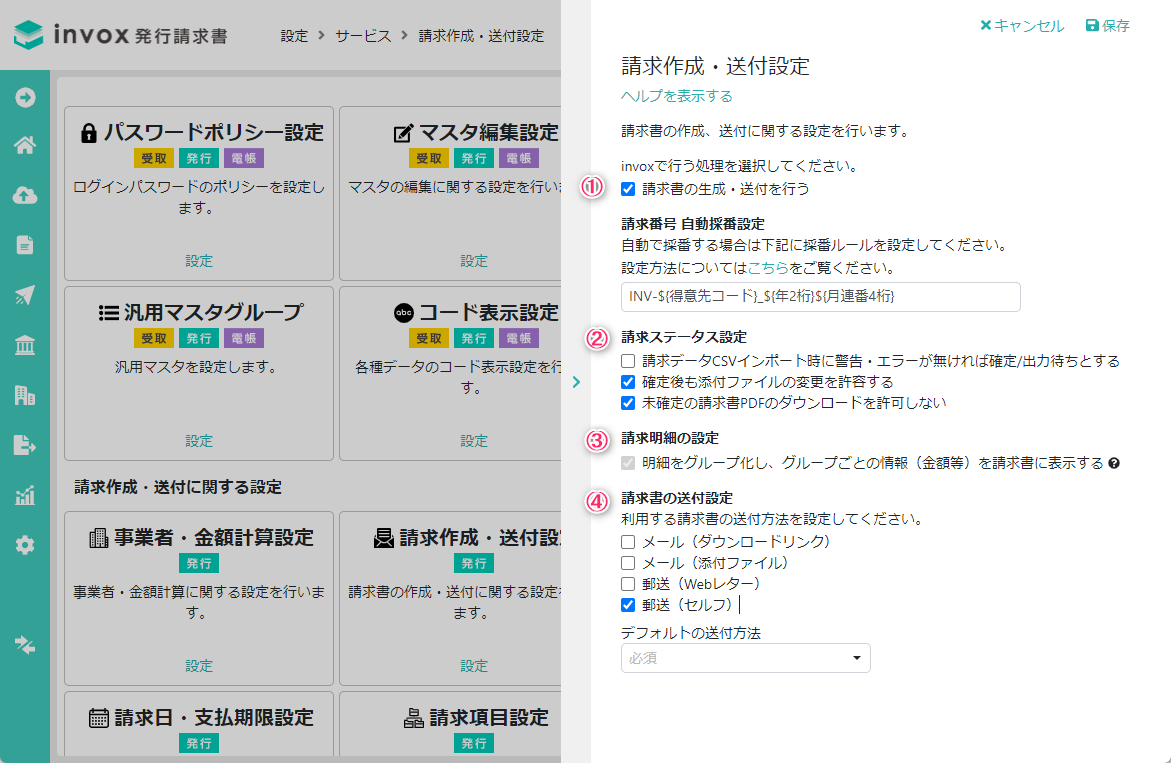 invox発行請求書における請求書の作成、送付に関する設定を行います。