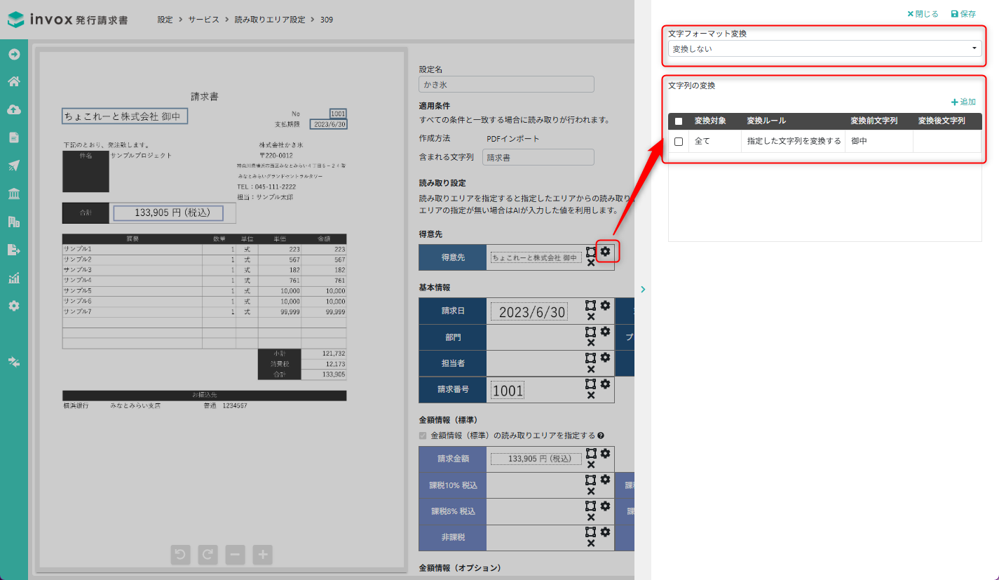 データ化時にAI OCRが指定エリアから読み取った文字列が設定したフォーマットやルールに従って変換されます。