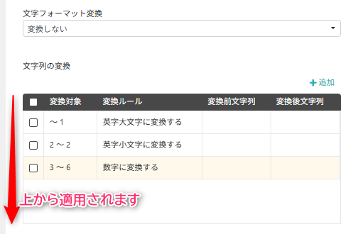 「文字列の変換」ルールは上から順番に適用され、適用後の文字列に次の変換ルールが適用されます。