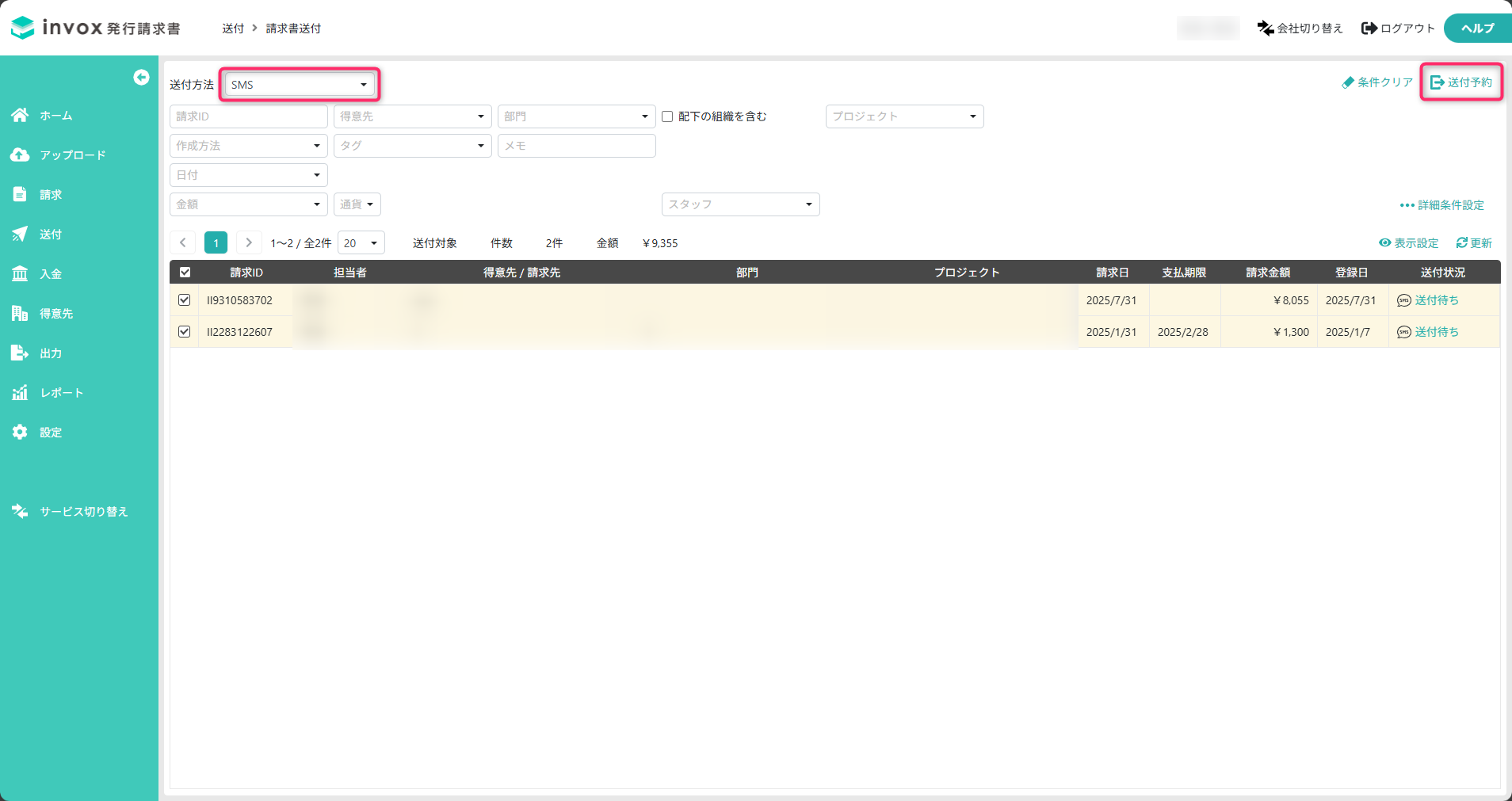 送付方法「SMS」を選択して「送付予約」をクリックしてください。
