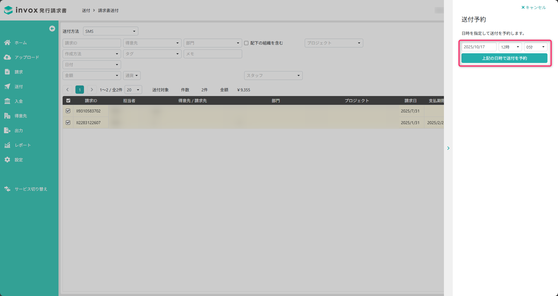 「請求書送付」を選択すると、送付方法・SMS番号・送信予定日時を確認する画面が開きます。
