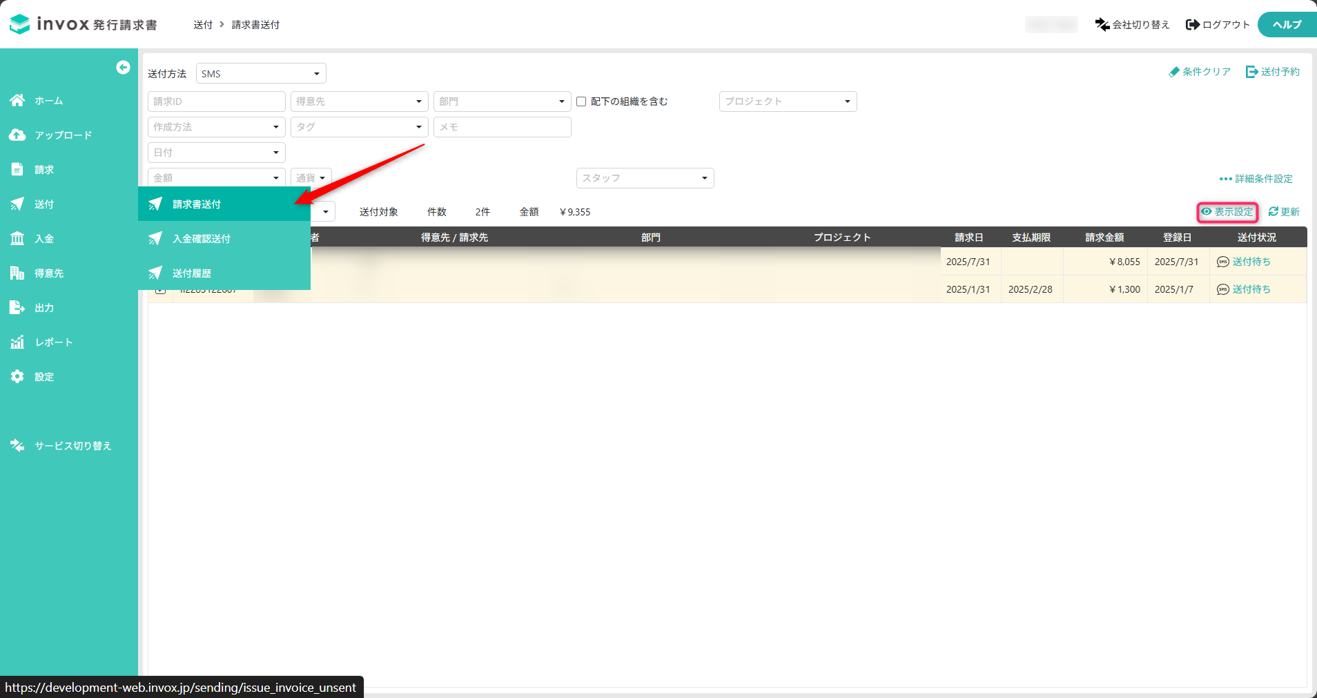 invox発行請求書は、確定した請求書を請求先にSMSで送付できます。