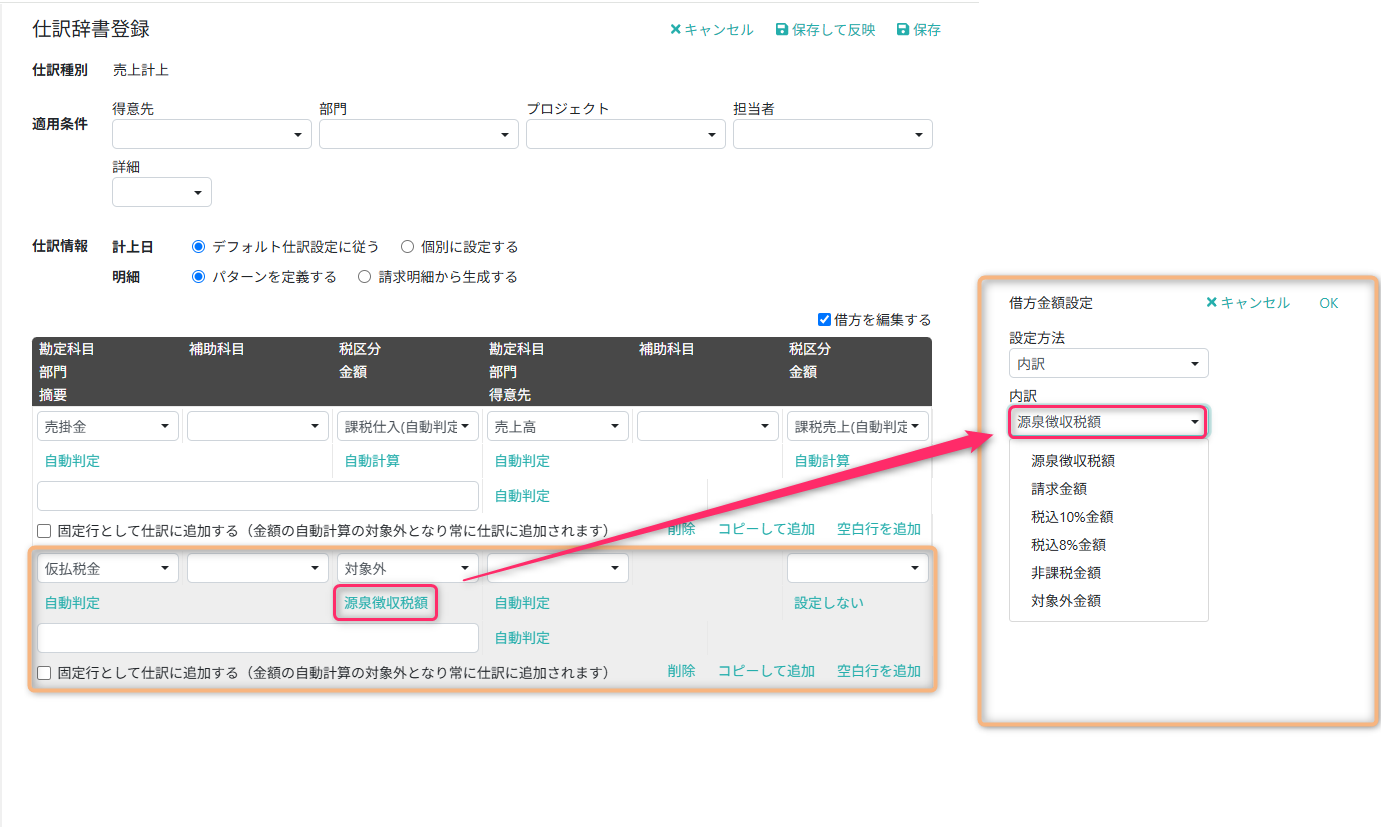 仕訳辞書:仕訳辞書に源泉徴収税額が定義されてません。